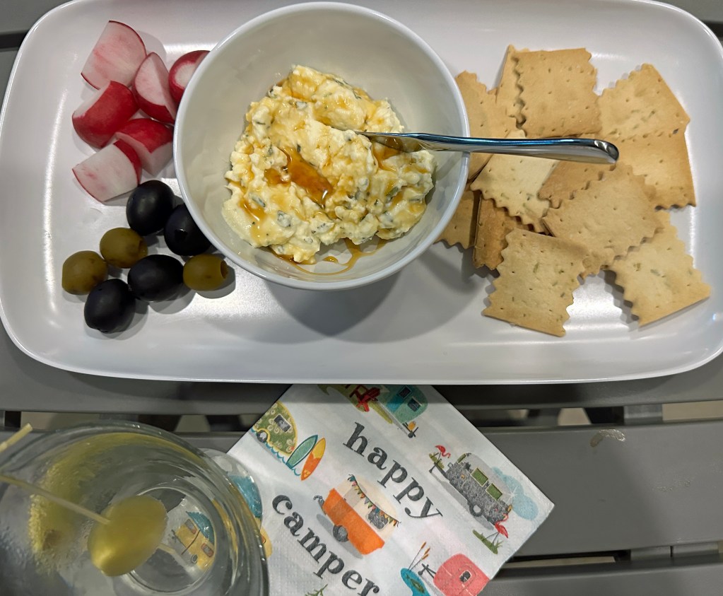 For our appetizer tonight, I whipped-up a ricotta spread with minced rosemary from our garden, sea salt and a drizzle of honey. Served with rosemary/olive oil crackers, olives and radishes, it was nice complement to our entree.