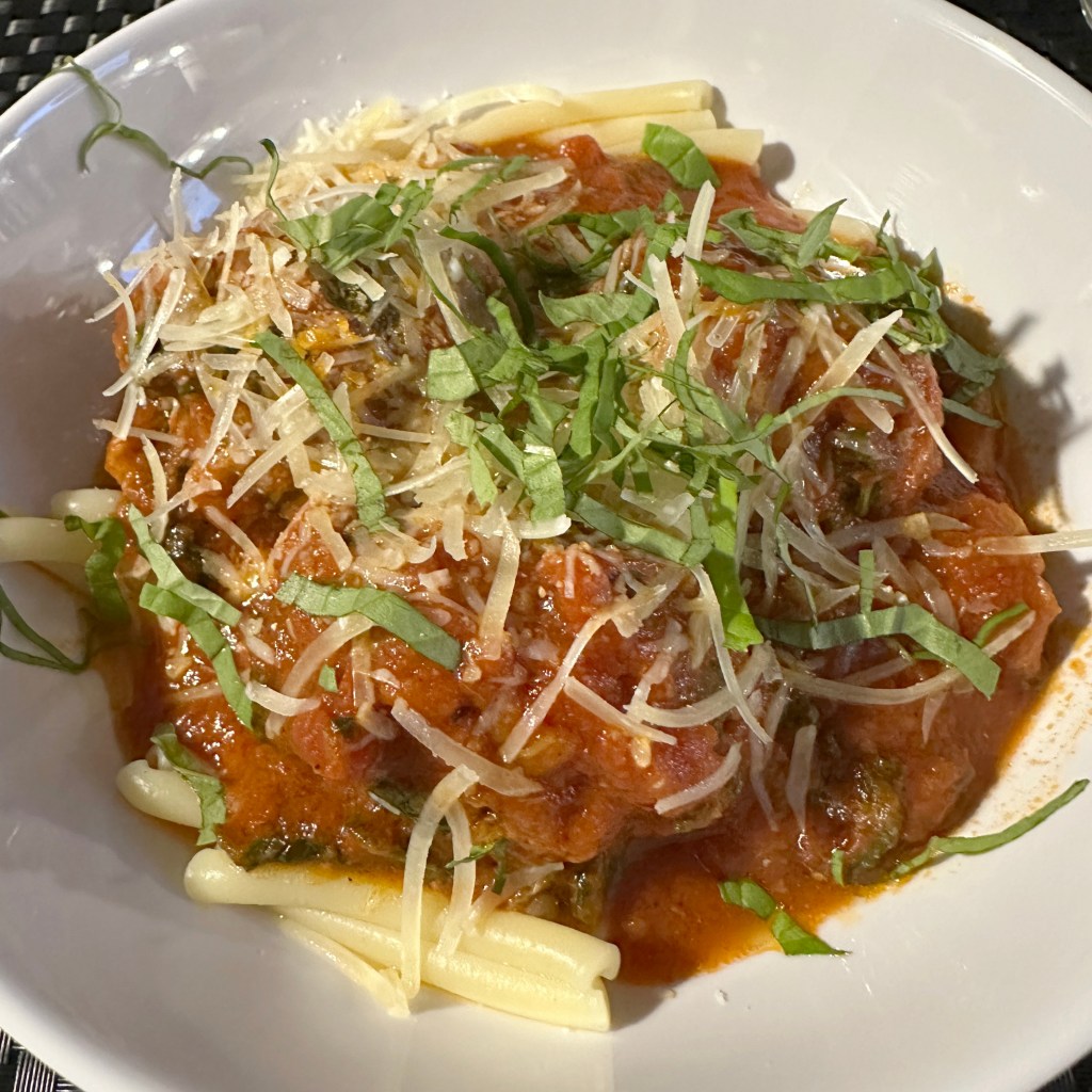 Dinner tonight was Spinach Meatballs with Pasta (free link) from The New York Times. I made the meatballs a few days ago with 100% beef and it made so many meatballs. One dozen large and 6 smaller meatballs. (Portioned out and vacuum sealed.) I poached six large meatballs tonight in Rao's marinara sauce. Tomorrow, we will have meatballs subs with the leftovers... in the baguette we bought at the Farmers Market.