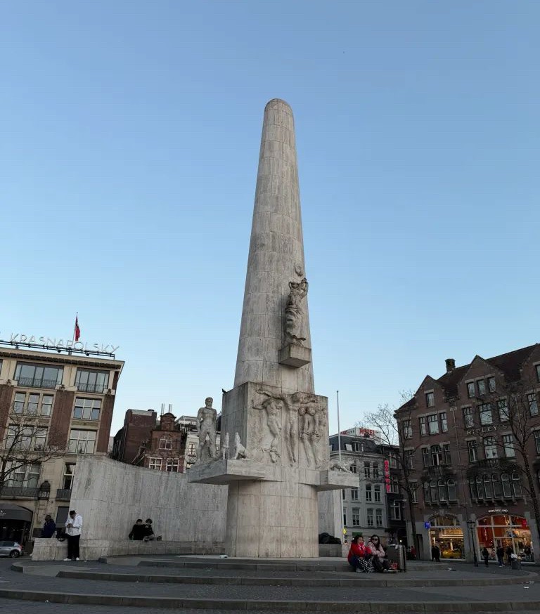 Lucile and I stitched for a while after dinner, but soon we turned our seats into beds and tried to get some sleep. None of us really slept much though and were quite fuzzy when we landed in Paris at 2a (LA time)… where we had to change to a smaller plane and zip up to Amsterdam. One hour flight, and caught a taxi to our hotel. We have two connecting rooms - the kids have twin beds and we have a king bed. Best thing: two bathrooms. All settled, we bundled-up and took a walk around the main square in Amsterdam, Dam Square. Here sits the Royal Palace (though the King no longer lives here and the building is only used for state functions).