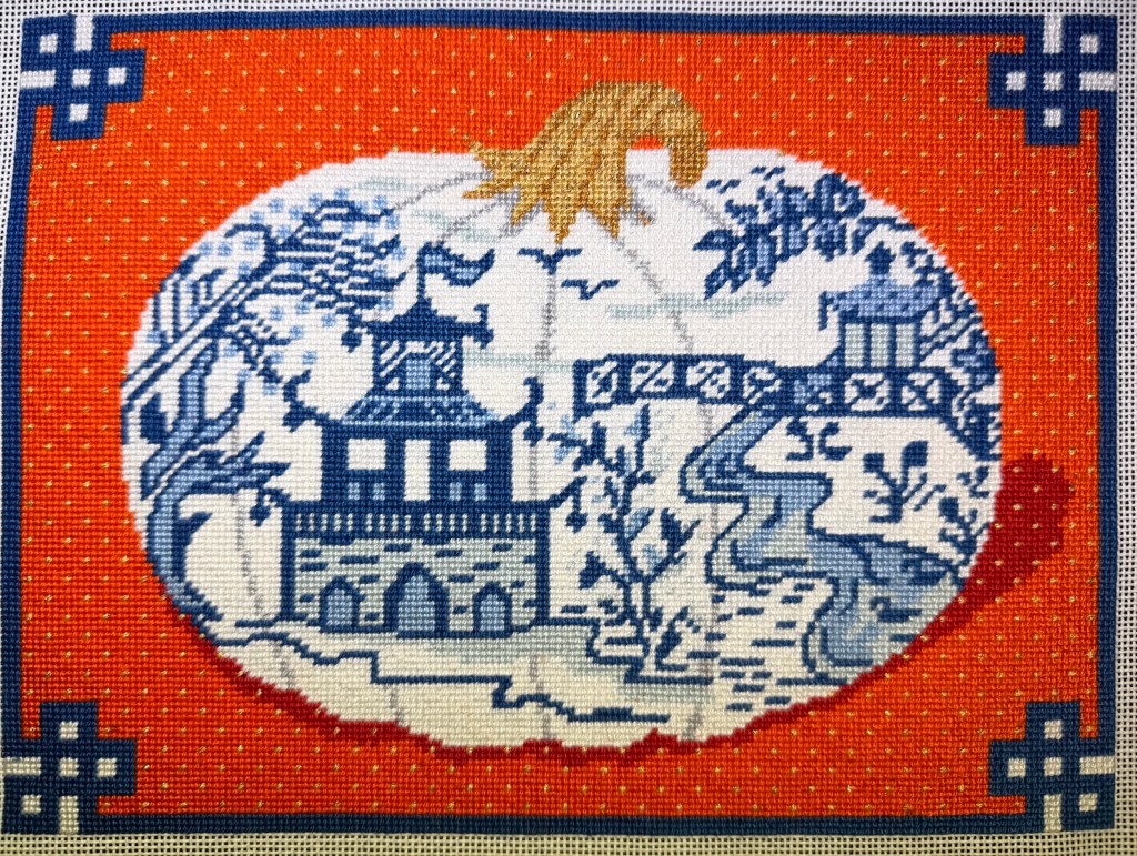 And this day’s journal ends with an update from home. My large (10x7.5 inch) winter needlepoint project was completed before we left. Finished it Thursday night. Whew. Stitched in silk, it will be a pillow for our house.