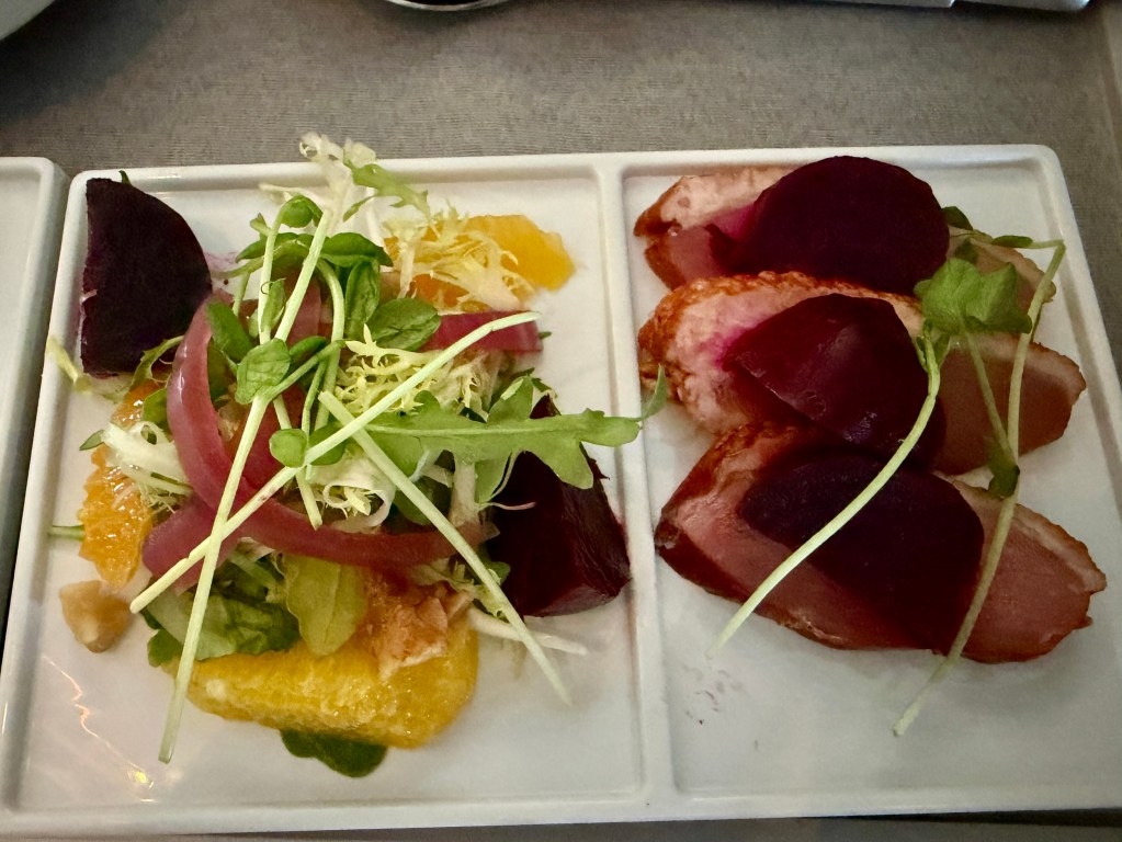 The plane was either new, or had been recently refurbished, as everything was shiny and clean. We had dinner - planned by Chef Daniel Boulud - and the first course featured smoked duck breast with roasted beets… and a citrus salad (also with beets)? Were they on sale?