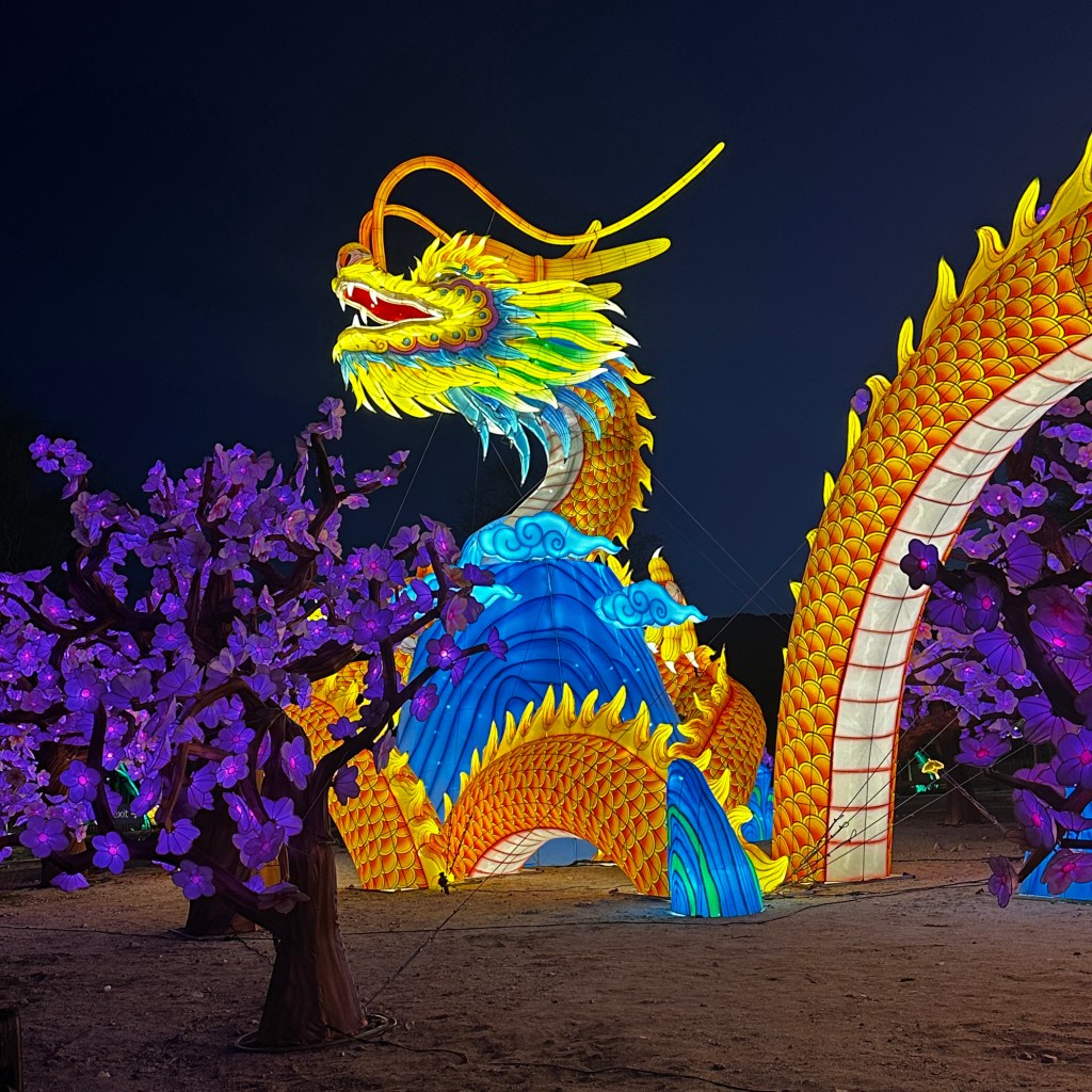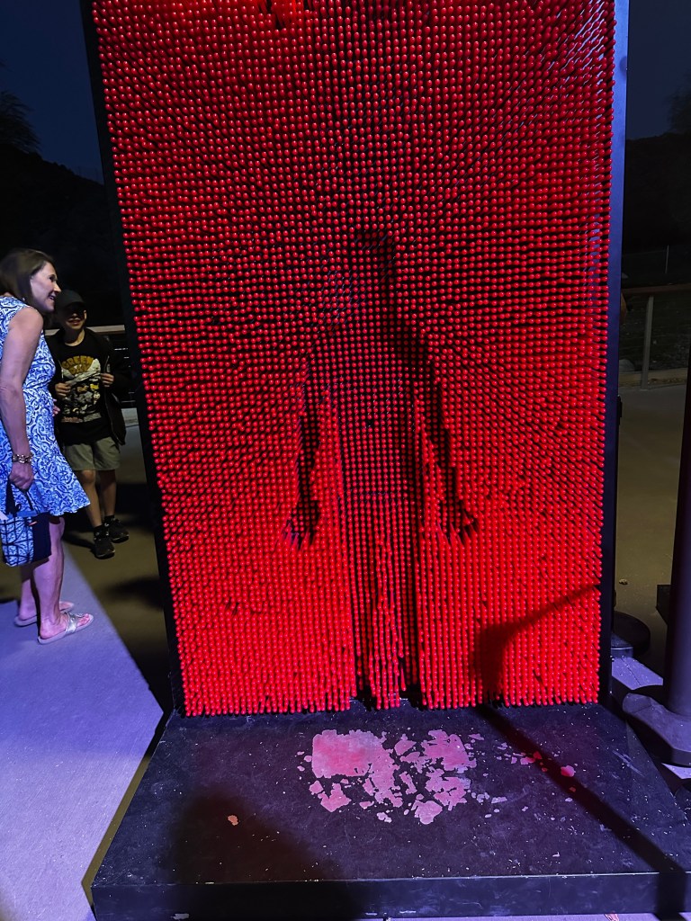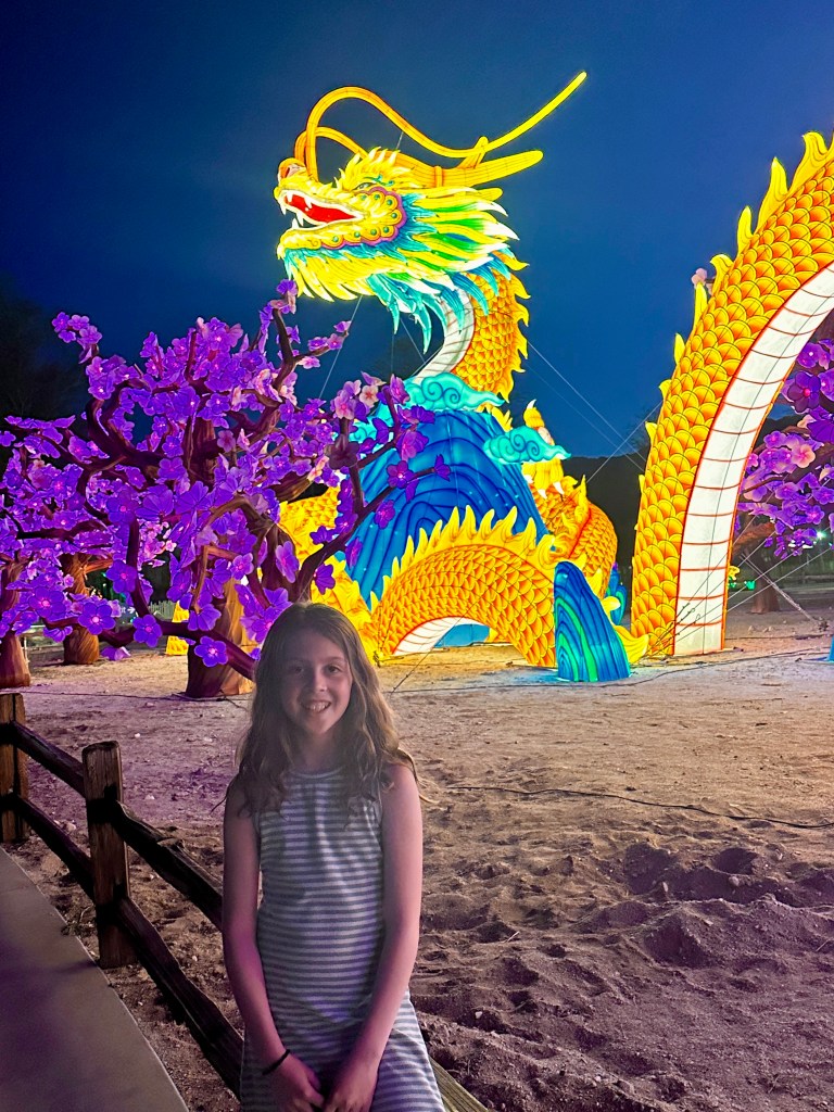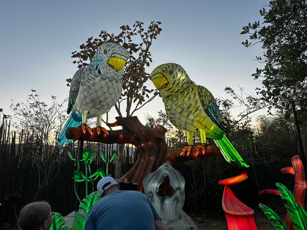 Our zoo, The Living Desert, is clever enough to plan their big fund-raiser, Glow Park, over March and April to take advantage of all the families in town for Spring Break. This is the third year we have attended. It is always an amazing evening with dazzling displays. This year was no different. We took Lucy out to dinner at a French place on El Paseo, and entered the zoo at 6:30p - so still time to see a few critters before the sunset.