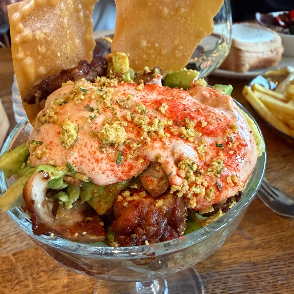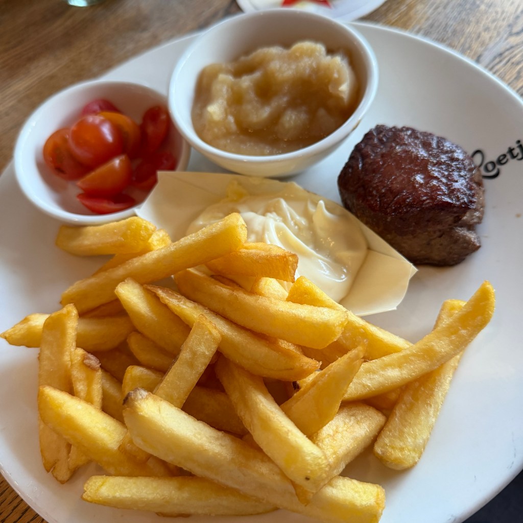 After we had finished with our A’DAM adventures, we rode the ferry back to the train station, retracing our steps to the front entrance, and walked across the street for dinner at Loetje. This steak house is a Dutch staple, with several locations in the country. They serve mostly just steak in a brown sauce. Tenderloin, three sizes. Dave had the small tenderloin, Leo had seared Ahi, Lucy had the kid-sized steak (which came with fries, cherry tomatoes and applesauce. I had the “chicken and avocado” salad which I mistakenly assumed would be shredded chicken breast (chicken salad) with avocado. Wrong. The chicken was marinated in (maybe?) Indonesian spices, grilled, with a spicy 1000 Island-type dressing. Not was I was expecting, but I ate the entire thing, served in a typical shrimp cocktail glass.