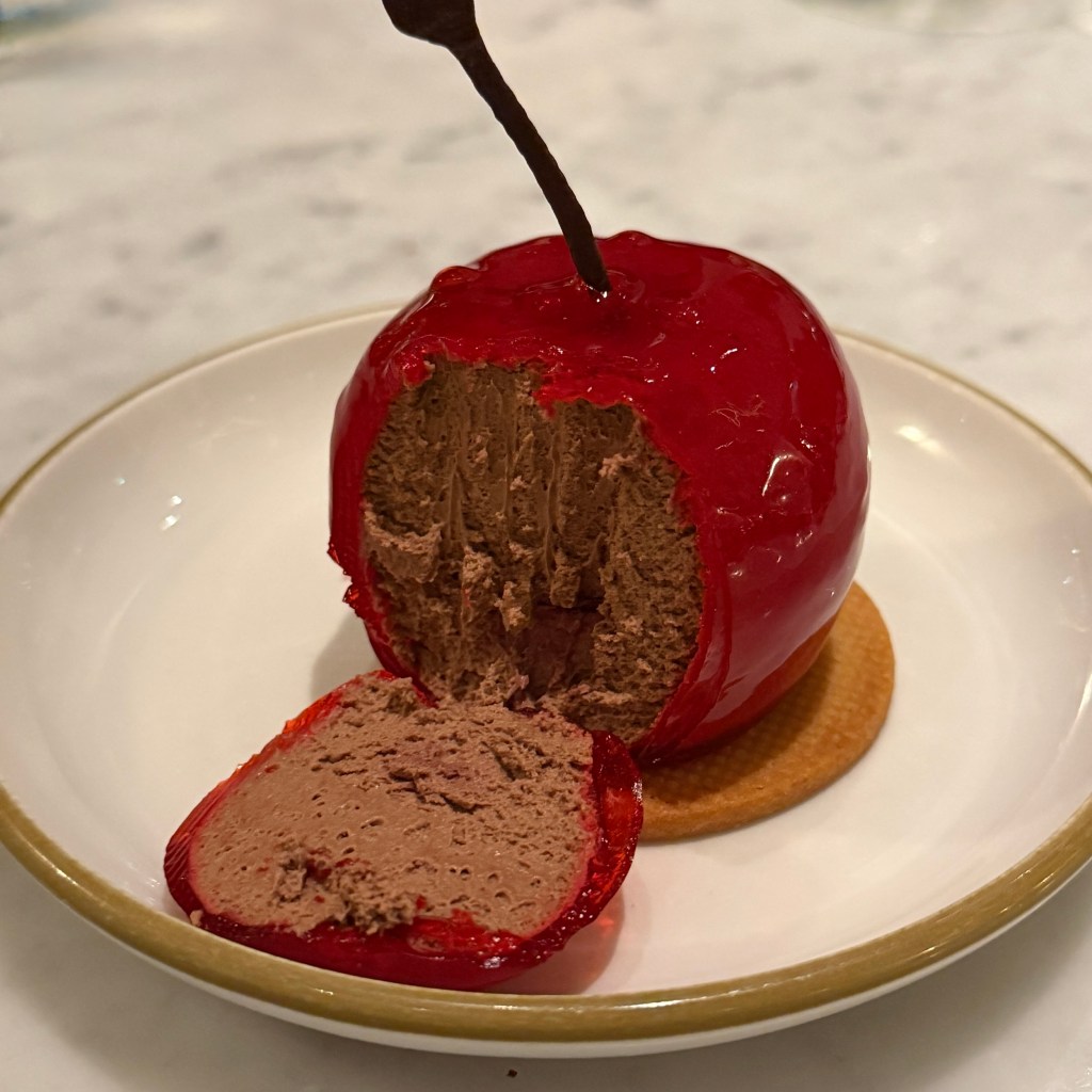 The chef somehow molds chocolate mousse into the shape of a cherry, then gets it cold enough to dip into a cherry glaze. A long stem is added to make the bombe resemble a cherry on steroids. Each kid took one down tonight.