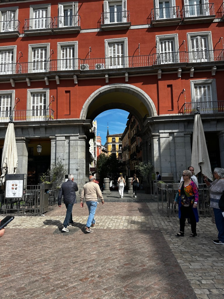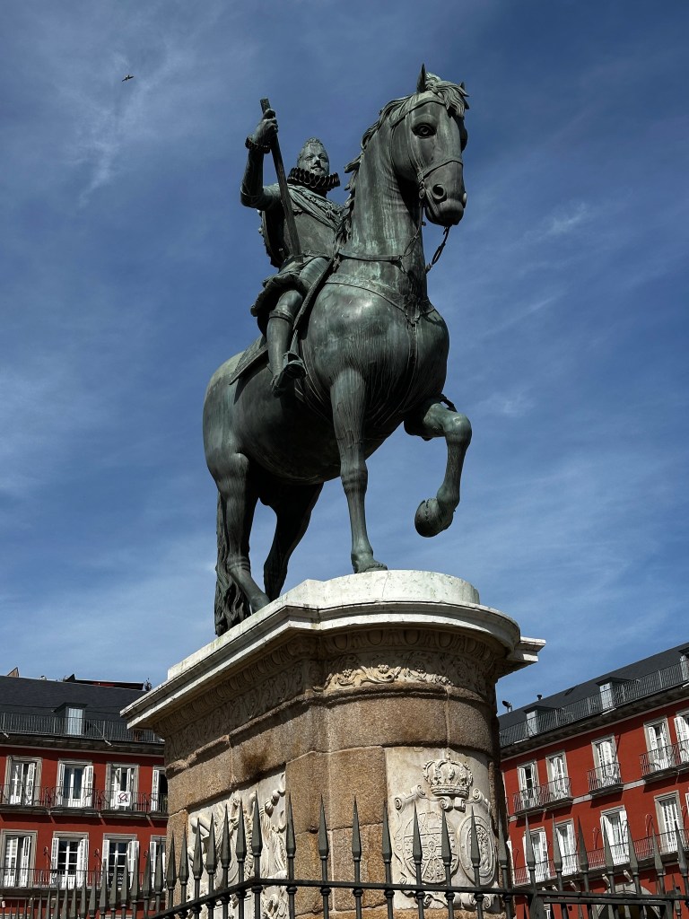 Just a few minutes from our hotel is Plaza Mayor, the largest public square in Madrid, it was built in 1580 when King Felipe III was in charge. There is a larger-than-life statue of Felipe in the center of the square.