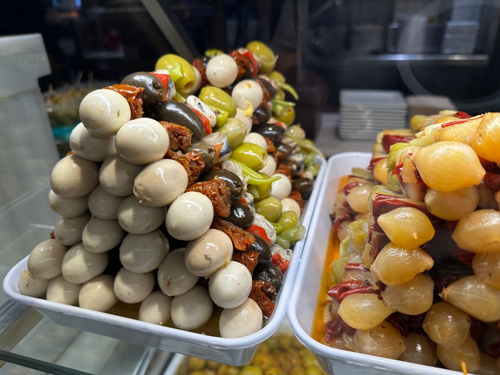 Olives, anchovies, dried tomatoes, quail egg (and who know what else?).