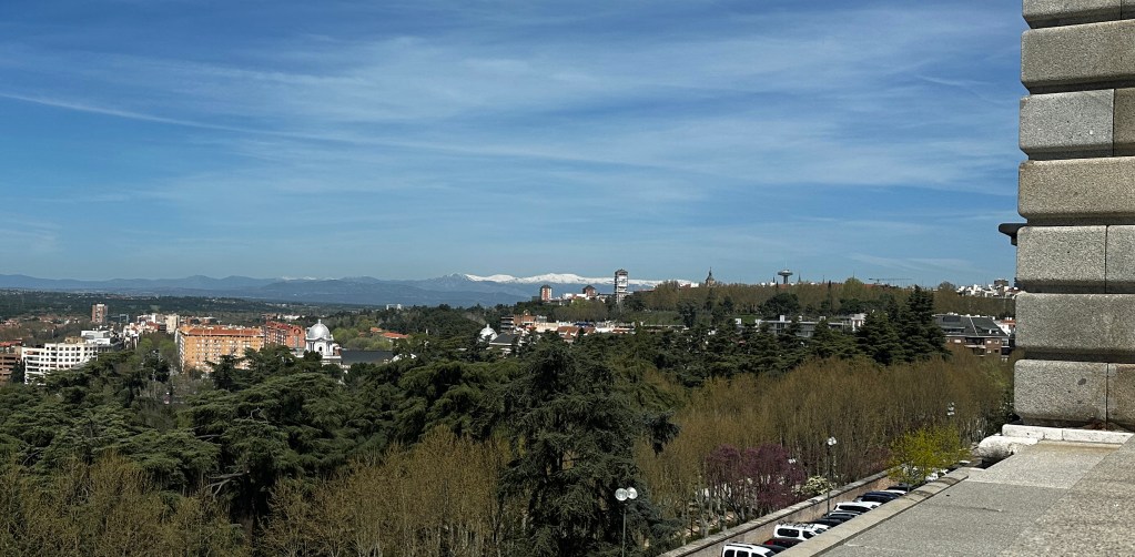 On the far side of the plaza is a view out across Madrid, to snow-covered mountains in the distance.