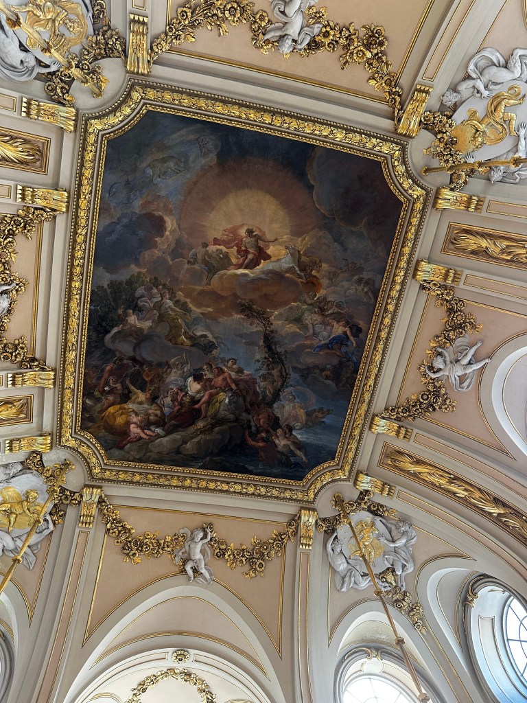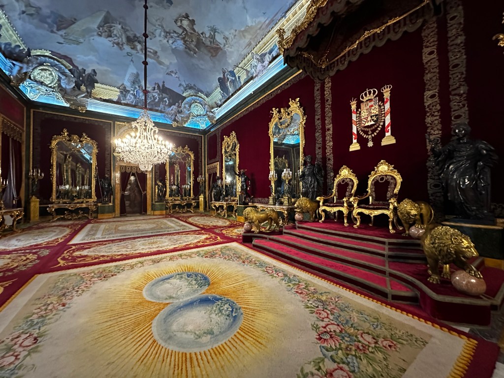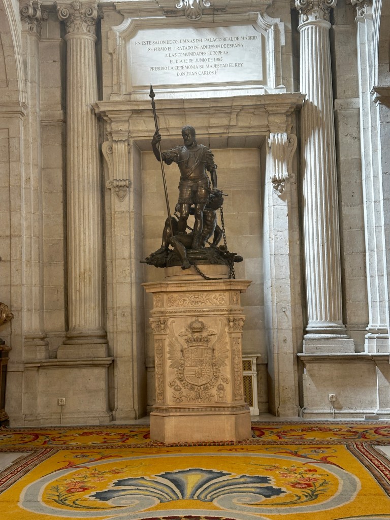 King Juan Carlos I abdicated in the Hall of Columns (photos below). The walls of this room are hung with tapestries depicting the Acts of the Apostles and has a statue of Charles V Subduing Fury, as one does. The ceiling fresco depicts the Birth of the Sun, 1762.