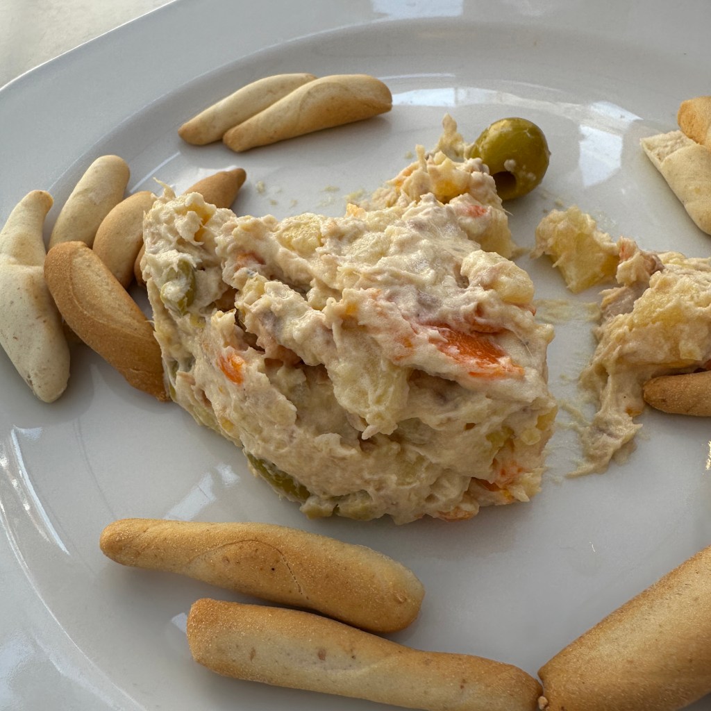 After a nice rest in our hotel, My Driver decided we needed a good walk before dinner. He was right, and we did have an interesting stroll around our neighborhood near Plaza Mayor. There are so many alleys and small car-free streets that seem interesting. It probably would be so easy to get completely lost - but after only one day, we had the lay of the land. The evening was warm and we walked until we found the 45th restaurant we thought looked good and went inside. We ordered two appetizers: cod fritters and a burrata starter with rosemary-roasted tomatoes and olives.