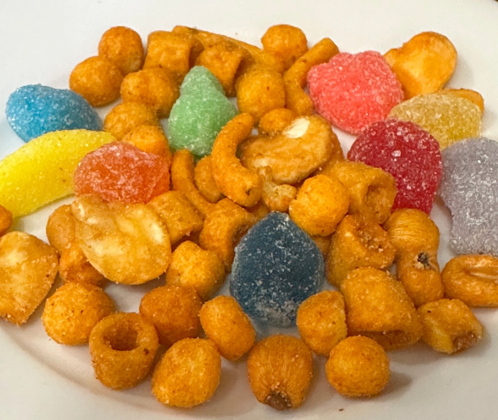 Soooo... we should have probably gone off to bed after dinner, but OH NO, My Driver thought we should explore yet another little alleyway on the way back to our hotel. So much is going on in Madrid at night. The streets were filled with people heading out to dinner at 10p! (It's Wednesday!) We stopped into a little place that had a Health Department sticker advising it held 22 people. It was on a corner and the Barcelona football/soccer game was showing on a television. The bar had a menu with a small selection of tapas and an impressive line-up of cured ham hocks dripping oil onto the counter. I saw a bottle of Tanqueray gin above the bar, so we grabbed a table. Though the stool would have been too small for Lucile, we were seated at a table. Dave ordered a beer. I ordered a gin tonic with lemon. The bartender poured the gin into the ice-filled glass. And he kept pouring. And pouring. Finally, I had to say something. Stop. Alto. Suficiente. He was so friendly! They brought a plate of what I would usually call bar snacks to our table, but it was unlike any bar snack we have seen. It contained gummy candies.
