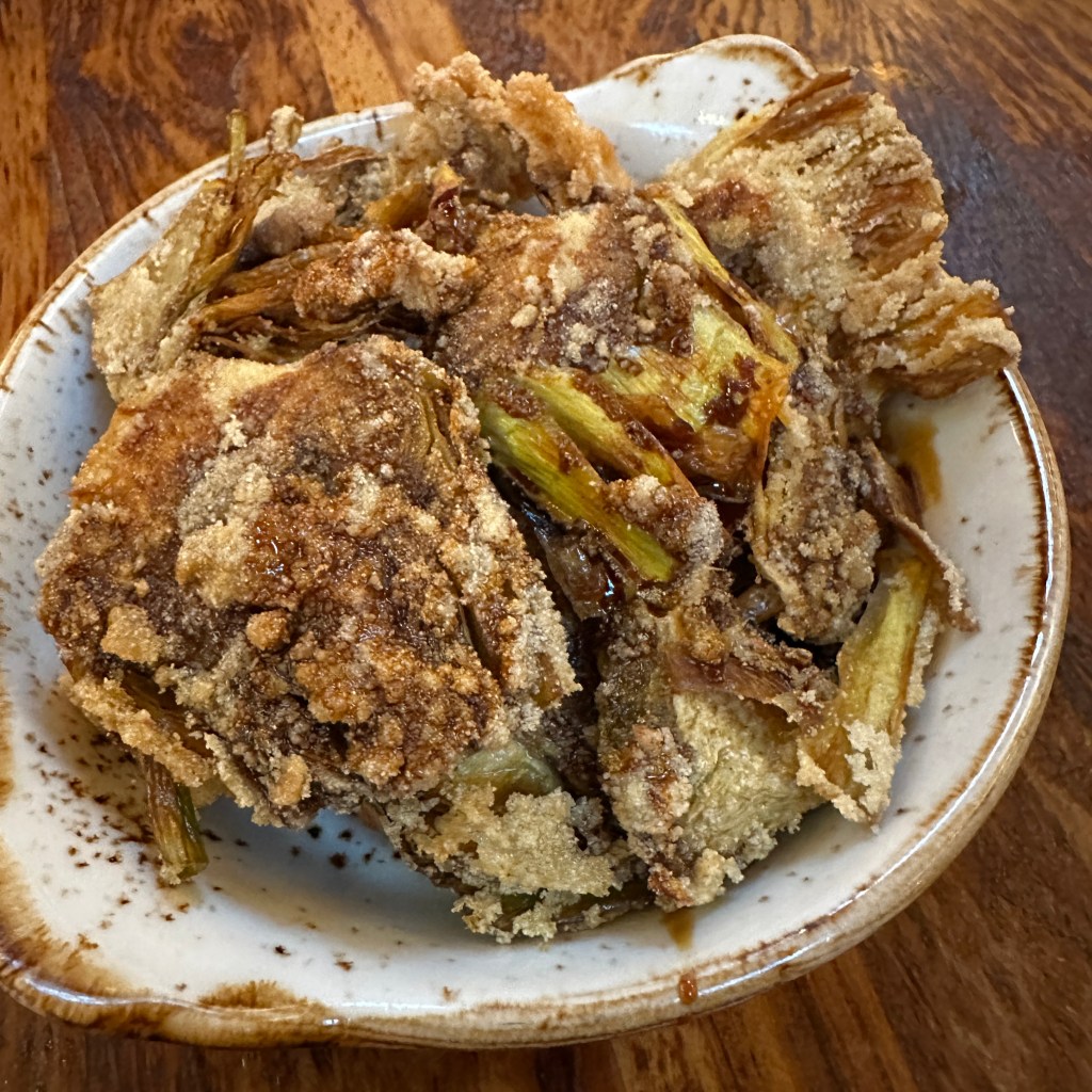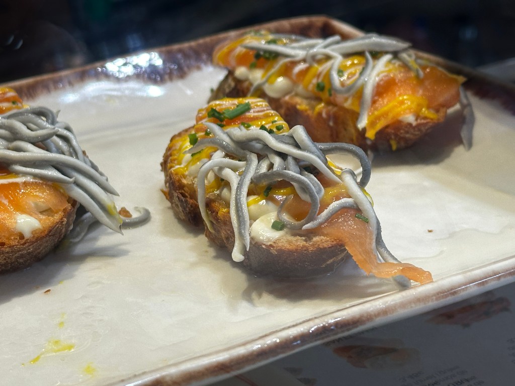 Again, here we are at 1p with nothing except hotel espresso machine coffee for fuel. I needed food and we were well-over 10000 steps. Walking up the touristy La Rambla street back to our hotel, we found a little (what else?) tapas bar and each had one little tapa and neither of the tapas were this tapa (photo below) we had to stare at the entire time we were eating our mini-lunches at the bar.