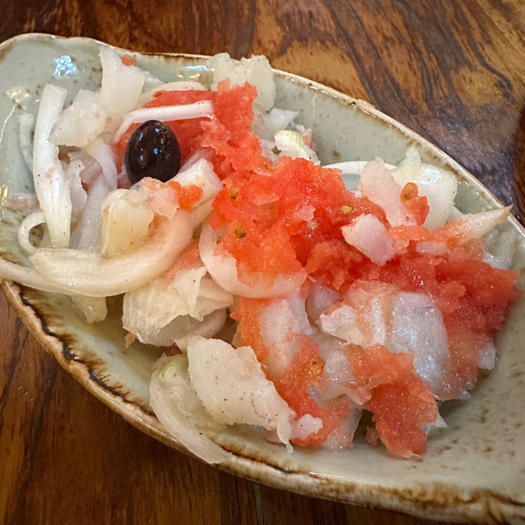 Shaved Cod Salad: ceviche with onion and grated tomato.