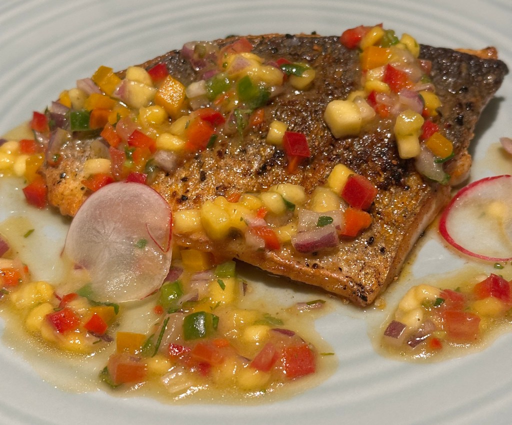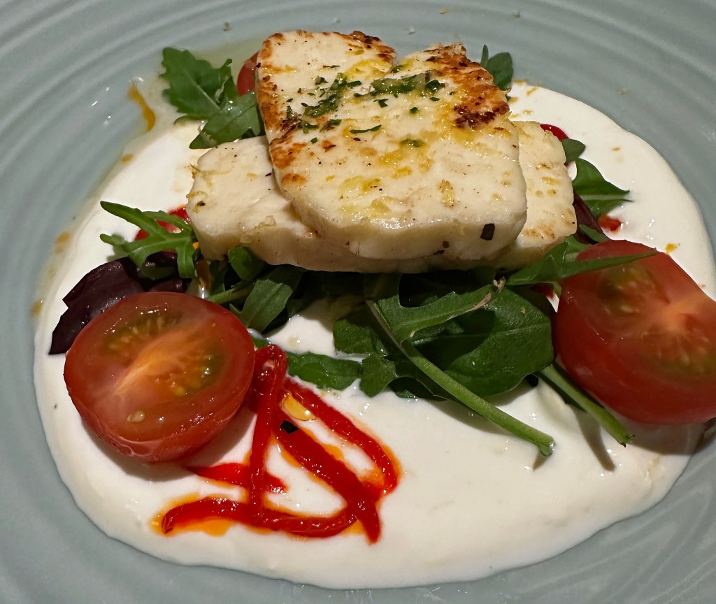 My main was a grilled halloumi salad with grilled red pepper and zucchini. DT ordered the special sea bream with mango salsa. That was enough. Delicious.