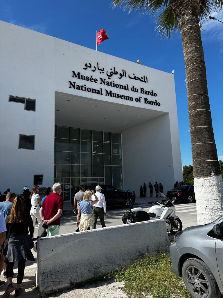 31 fellow cruisers joined us on a very nice coach. We had a driver, Ali, and a tour guide, Mohammed, and a very silent, unnamed security guard who shadowed us all day, probably due to this? Our first stop was to the Bardo Museum, but we had no fear today as the Prime Minister of Egypt and his wife, were also visiting the museum. Lots of black Mercedes and men in black suits.