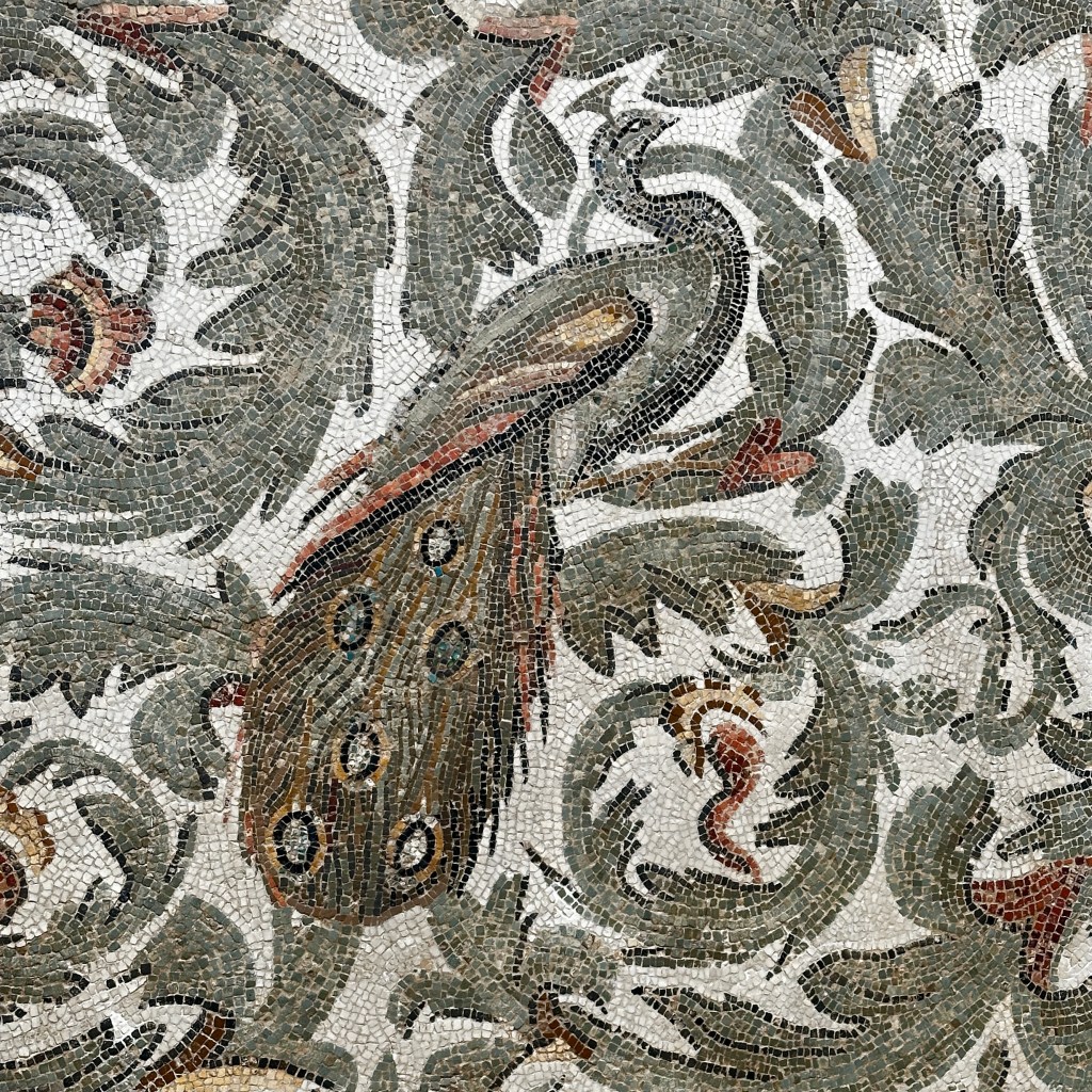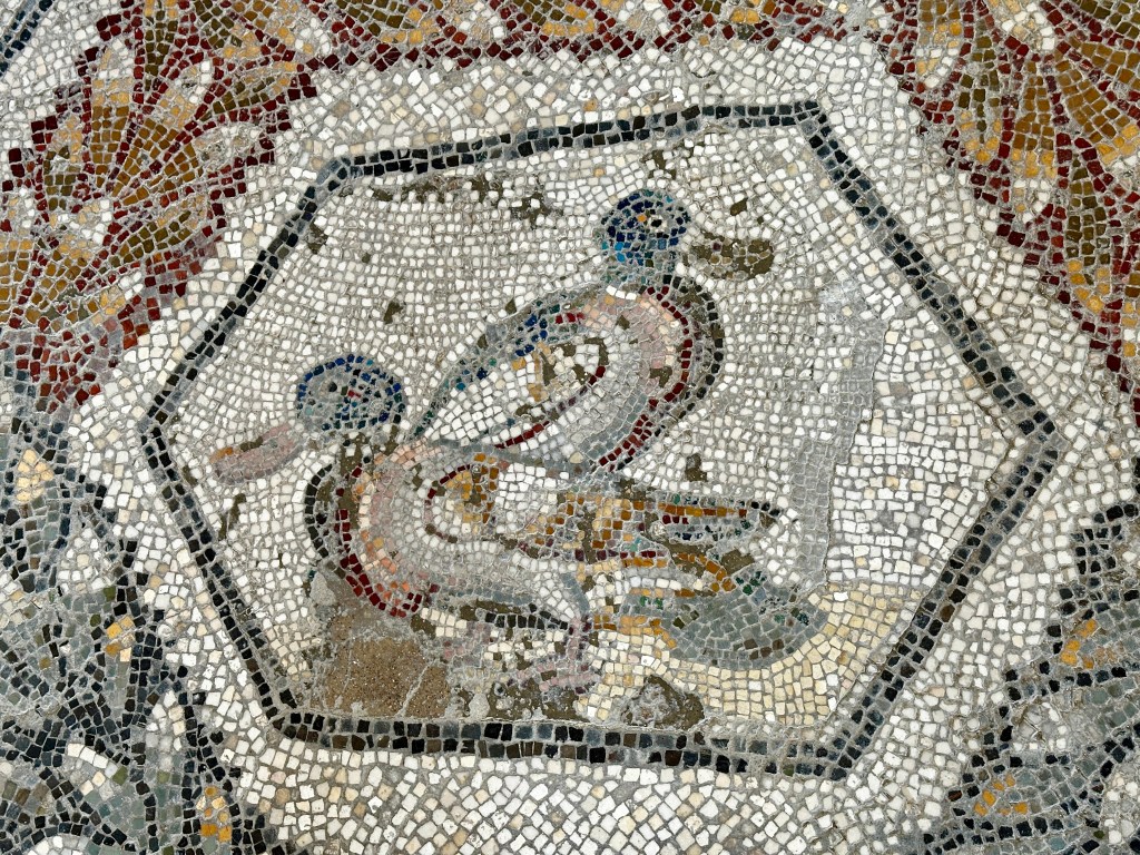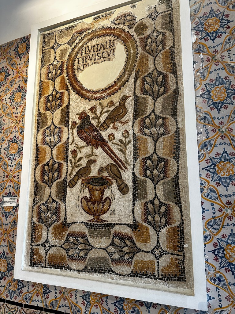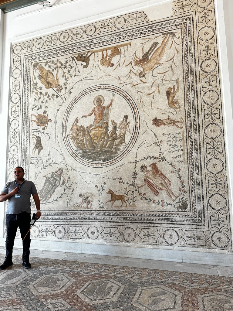 This mosaic shows the four seasons and Poseidon, with several symbols of Christianity in the center. Mohammed told us this mosaic was found at the bottom of a pool, so was not worn by foot traffic.