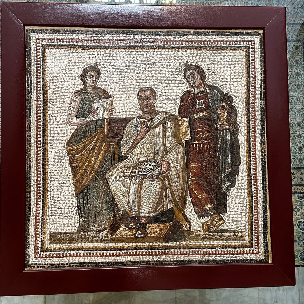 The Bardo displays mosaics found locally. They were carefully removed from the floors, walls, or pool bottoms, by digging under the mosaic, the filling the gap with cement and lifting the murals out in one piece. Fascinating. Most of the mosaic pieces are smaller than a finger nail.