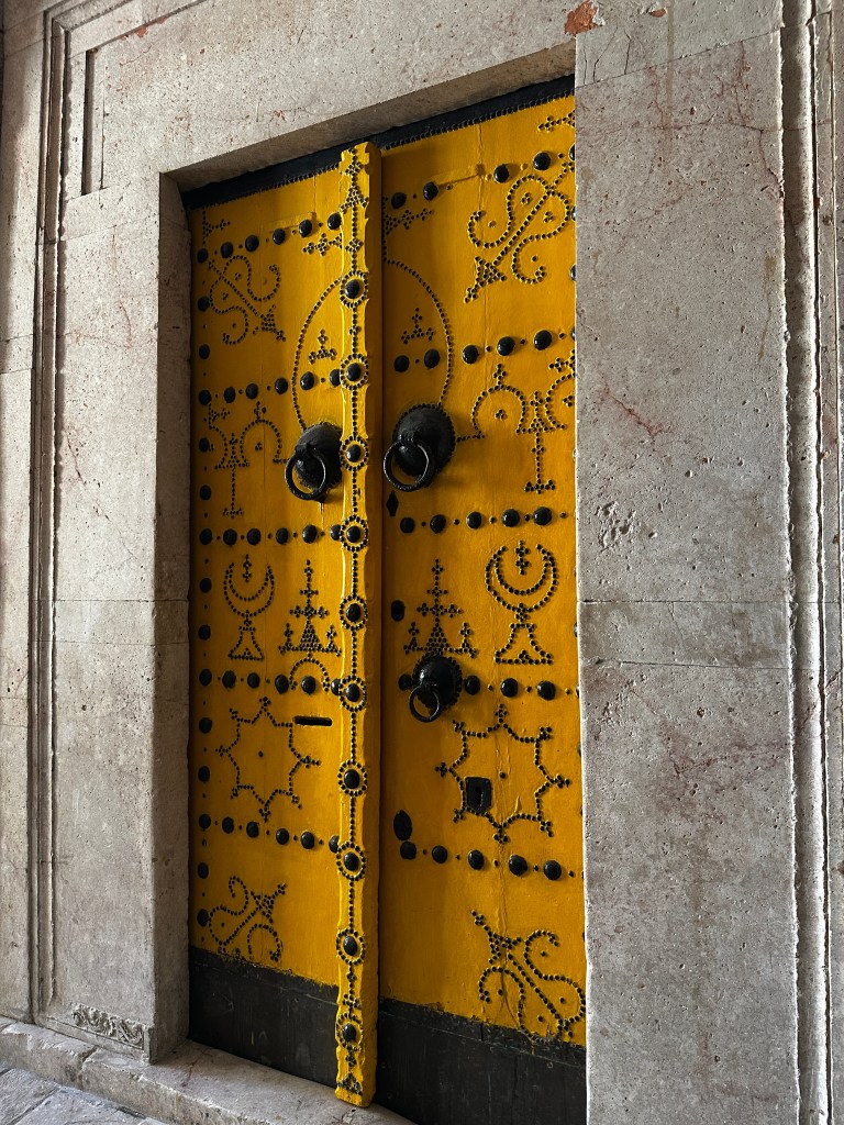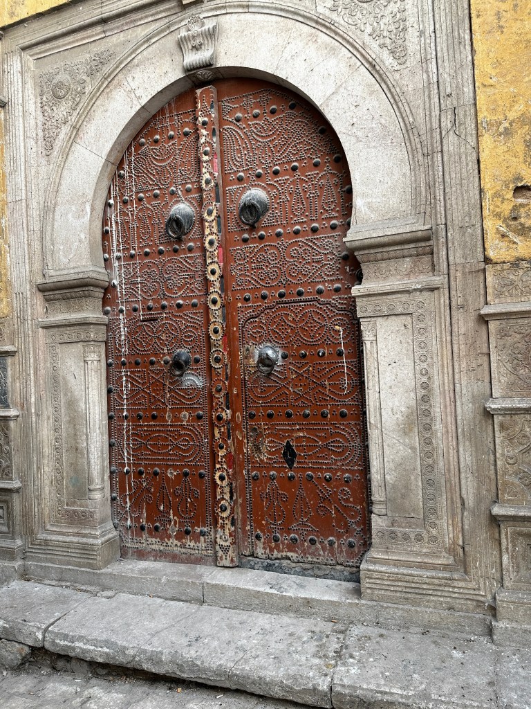 There are two very interesting things about these huge doors. The first is that they are large and heavy and very difficult to open/close. Please notice a cut-out on the right door - like a secret little door? It is not even five feet tall, so most people would have to duck to enter the house, but it is certainly easier to open than the big doors! The other thing you may notice are two sets of metal door knocker rings - one up high and one below. Why? The taller, larger knockers are for men to use, and the lower pair are for women. Our guide demonstrated and the larger ring made quite a louder knock than the lower. This is so the Muslim lady of the house would know if a man or a woman was on the other side of the door, if it would be necessary to pull her headscarf on if it was a man knocking.