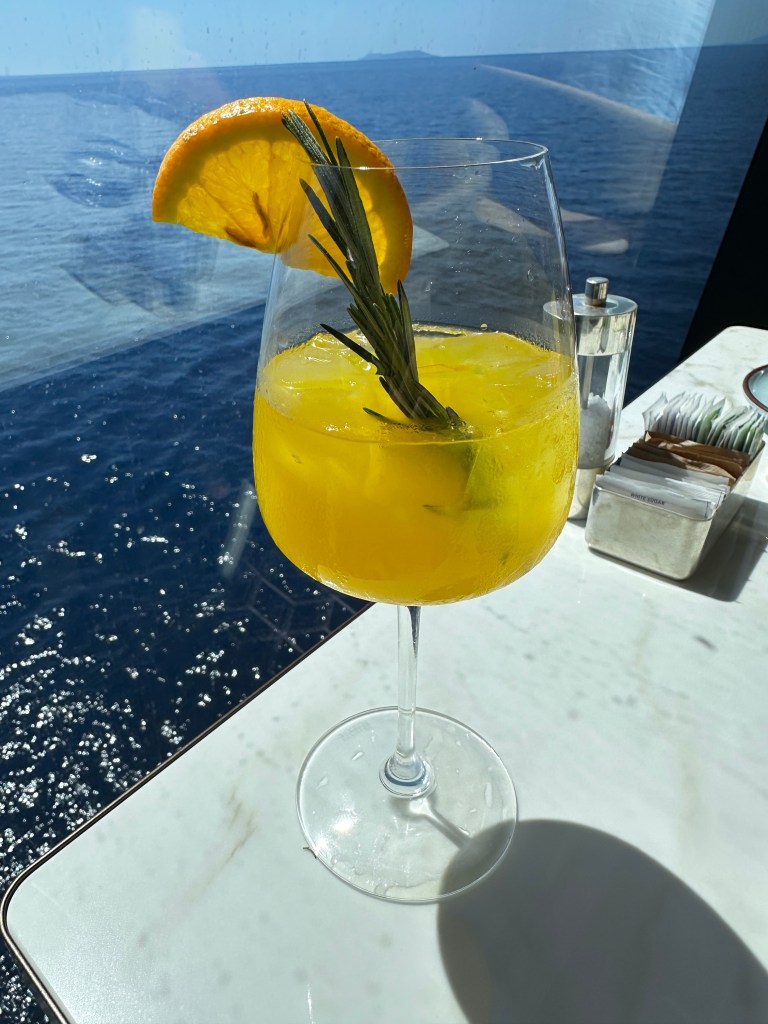 Oh, we were really having a fun brunch today, sitting in the sunshine enjoying being waited-on like we were the King and Queen of the Mediterranean. Then they began serving a "brunch" drink with gin, mandarin orange juice, rosemary - topped with a splash of tonic.