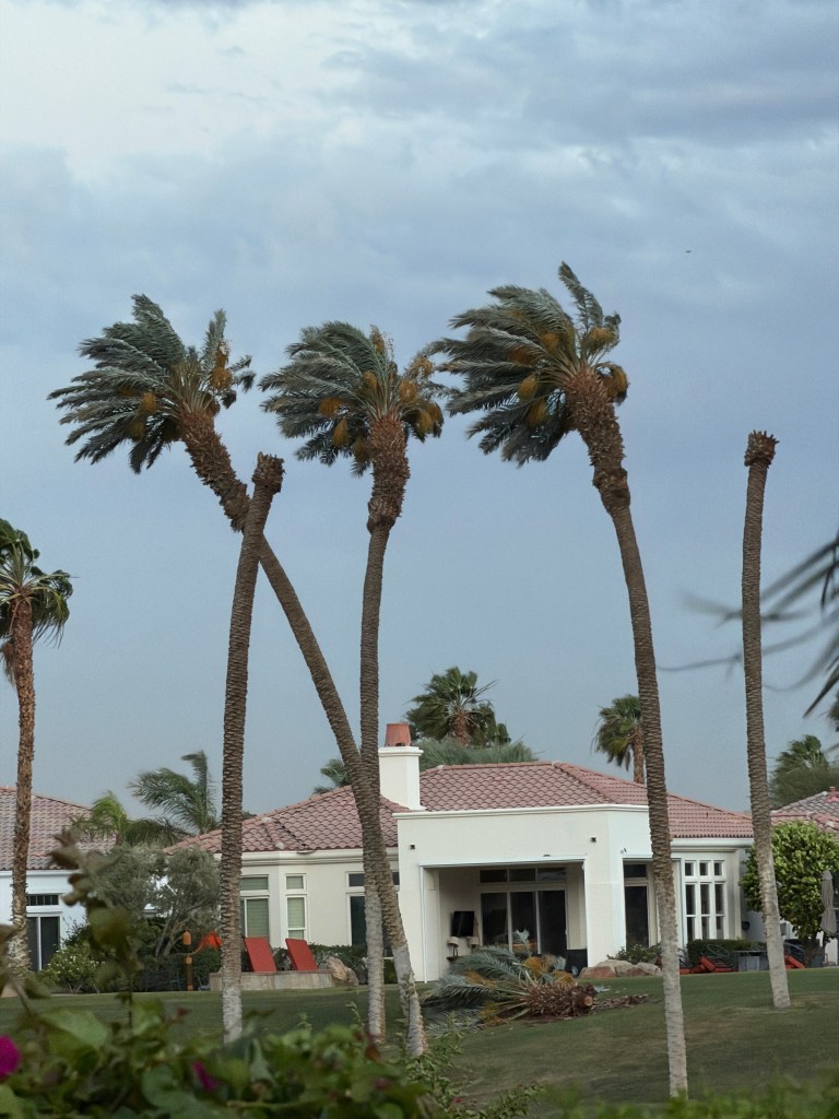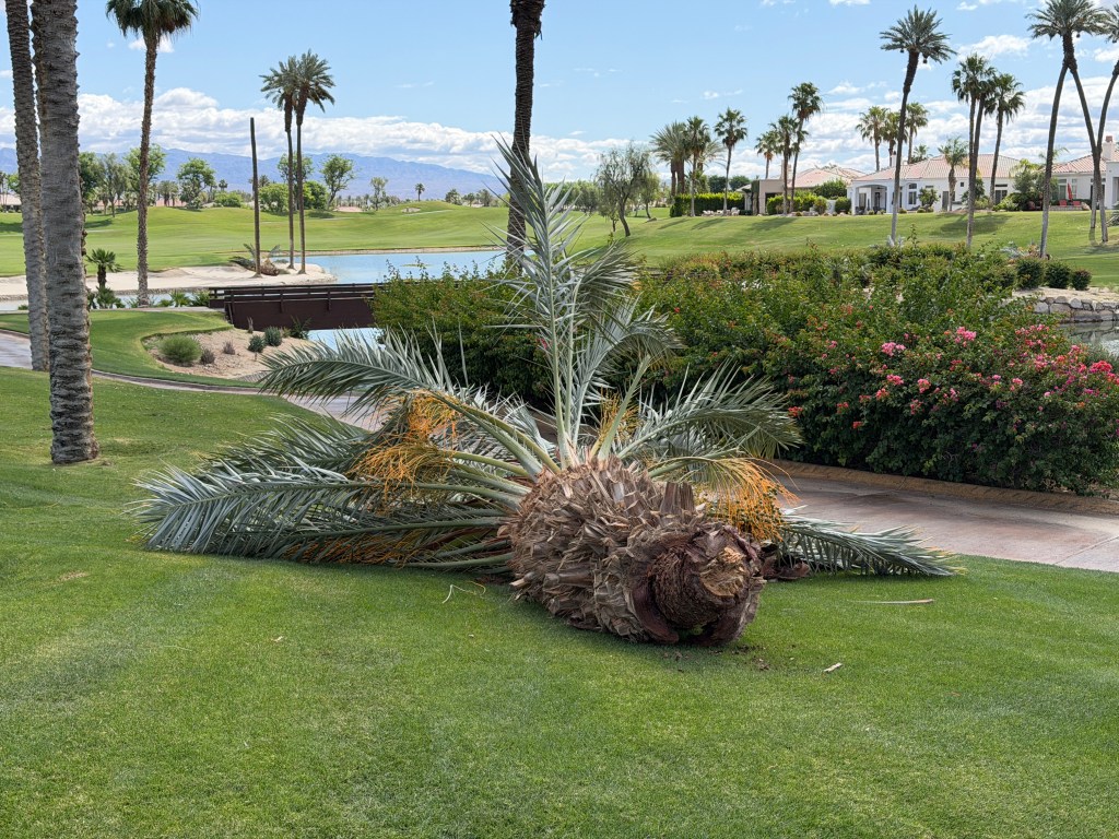 We learned from the gardeners at our club the trees die after losing their heads. They will need to be replaced. So sad. Each tree is well over 40 years old. (The trees are date palms that no longer produce fruit - usually around 40-45 years old. Menopausal date palms. They sold for landscaping.) I feel the trees are very strong, as it is often windy in the Coachella Valley... but last night was just too much.