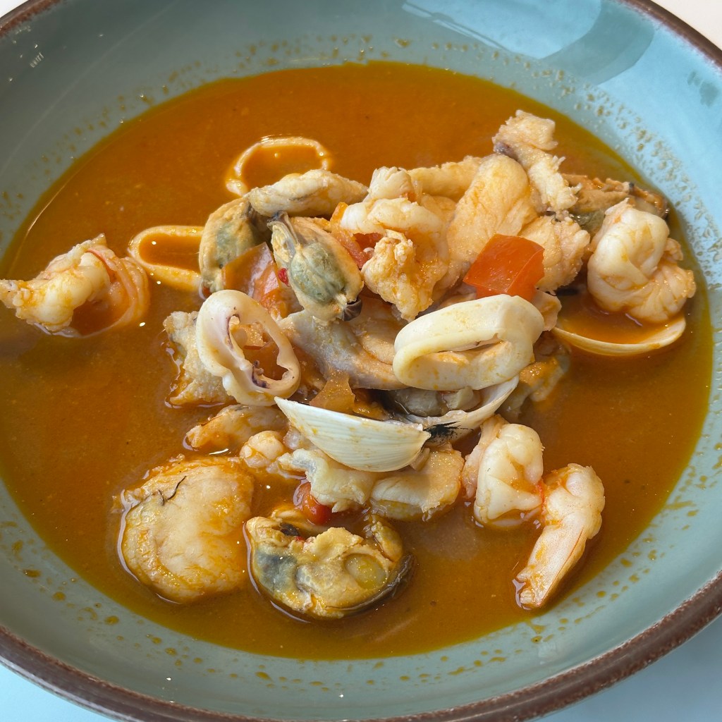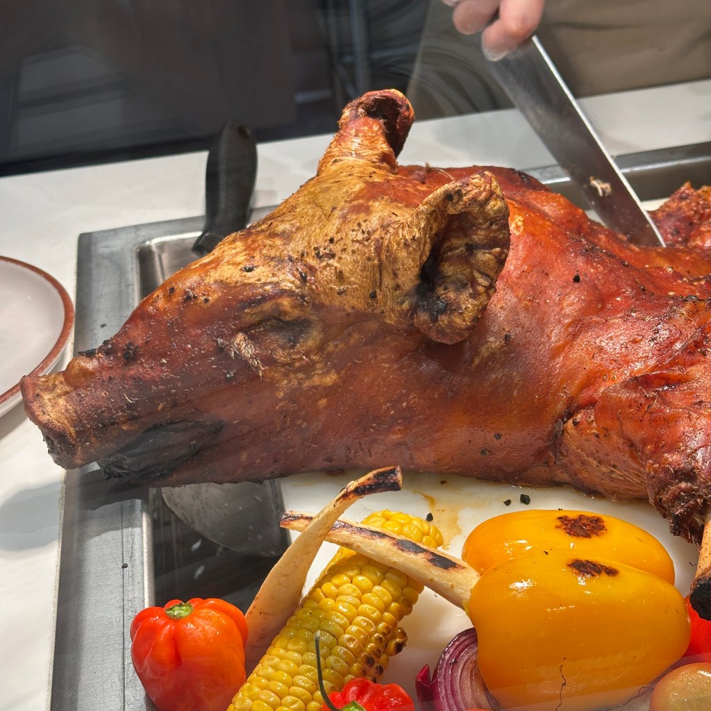 The entrees today were roasted suckling pig, paella, (potato) tortilla, patatas bravas, and braised endive. The tortilla cake was ice cold and the bravas were terrible. This was the first time the food disappointed me on the ship. I was forced to eat two desserts instead. Ah, the humanity!