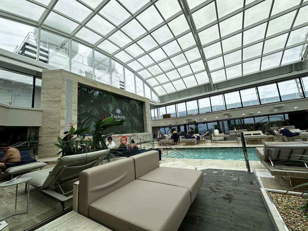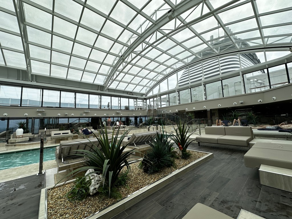 We sat by the pool this afternoon, napping, reading and stitching. After all the dust and debris from docking in a working port (lots of grain was transferred from a ship next to us and the hulls (of whatever it was) were flying everywhere. Our deck was covered in white stuff. The roof was closed over the pool all day and it became like a sauna late in the afternoon. I asked the pool staff if they were going to open the retractable roof and they said NO! NO! NO! It took them 18 hours to clean the pool after docking in Casablanca.