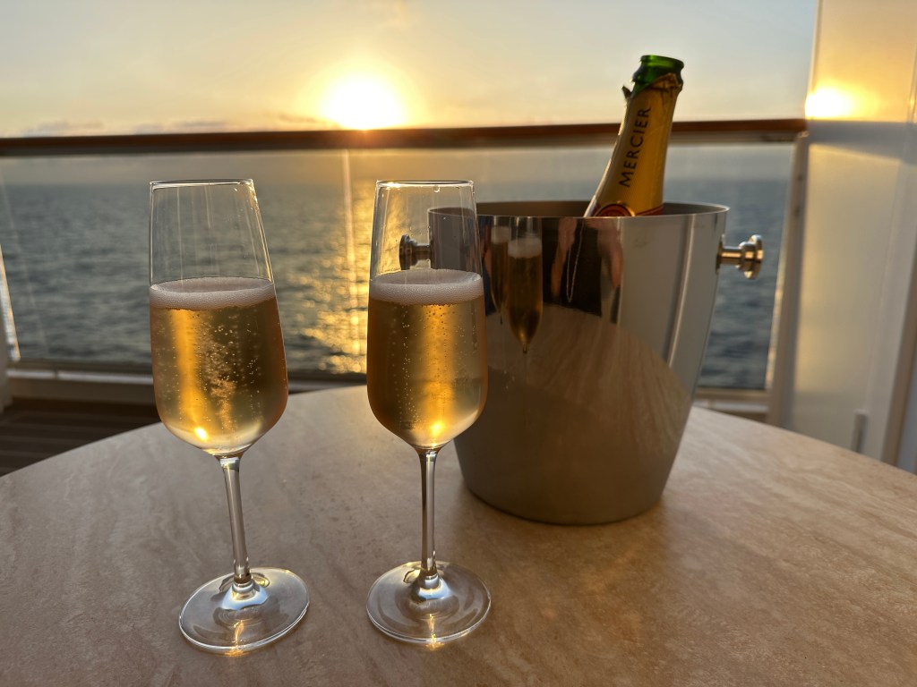 Marble & Co. also offer small side dishes - and by small, I actually mean small. Not more than 1/2 cup. I chose chard in a cheesy sauce (above) and it was just yummy. Dave had a ribeye, but he could not finish it - I ate almost all of my meal. No dessert, but when we returned to our room after dinner, it was still light outside, it was nice and warm on the Atlantic and it looked like we were going to be treated to gorgeous sunset. Time to open the bottle of Mercier champagne that has been in our fridge since we embarked over two weeks ago in Barcelona!