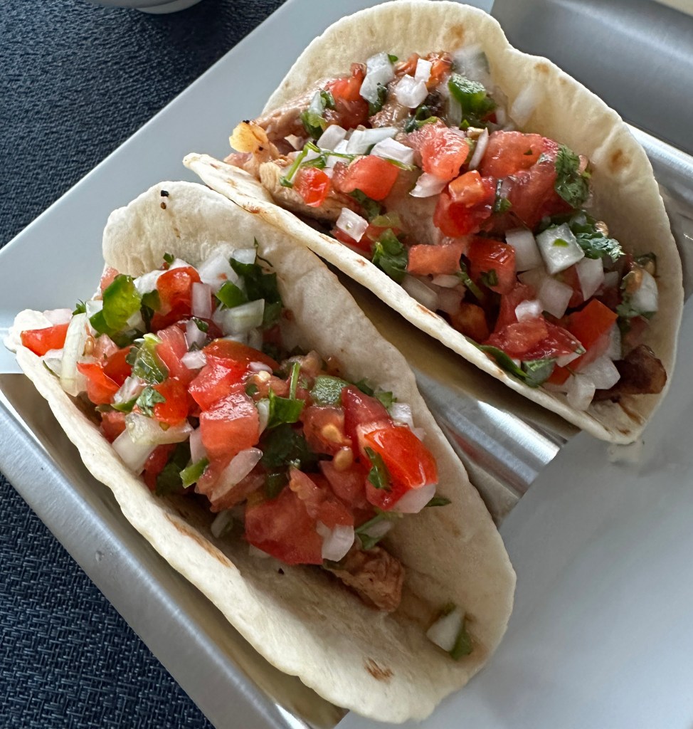 Though we were so beat after packing up for an early departure today, last night two chicken thighs were marinated in lime juice, taco seasoning and cilantro. DT grilled the thighs, and the meat was shredded and served in soft-shell street-taco tortillas with pico de gallo (house made!). They were so good. Maybe it was the fresh pico de gallo, but we really enjoyed our dinner tonight.
