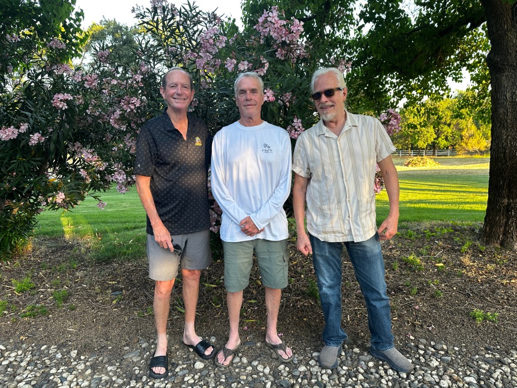 The Taylor Brothers gathered on Saturday. Niece Meghan (lives in Sacramento) had requested Mexican skirt steak tacos, so Gina marinated the beef and also prepared refried beans and rice, and several other sides. I contributed guacamole and a pitcher of my famous margaritas. Meghan made flan, so it was a perfect menu.