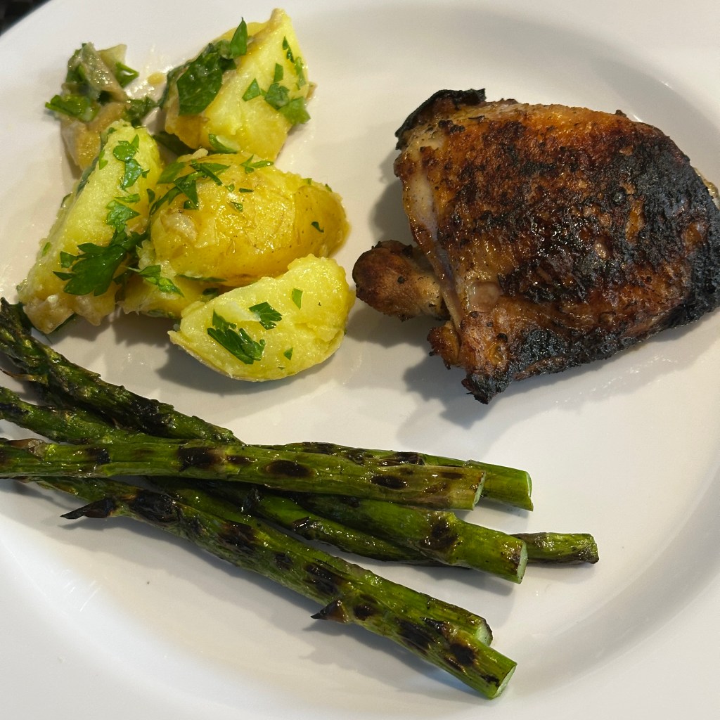 After checking-in, Dave went for a walk and I fought and fought to get the stoopid Dish TV dish to figure out where we were. The Dish satellite television system is sometimes ridiculously easy and the next time I want to pull my hair out. Why can't they figure it out? I had to re-set our receiver TWICE. Ugh. Anyway, all was well by game time (Dodgers tonight as we are close to San Francisco the Giant game is blacked-out). I had marinated chicken thighs in Gina's fantastic sage, so DT grilled the chicken and Gina's asparagus spears outside. I boiled four of the day-old potatoes and tossed them with Jacobsen Sea Salt, butter, and chopped parsley. It was gourmet all the way, but we both agreed the potatoes were the best dish.