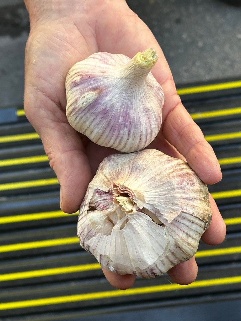 Vegetables are planted in cycles. Month-by-month. Whatever grows best in whichever weather/season. As soon as something is over/bolts, something else is planted in the raised bed. They eat out of this garden year-round (especially since Gina and Steve dry/freeze/jam/barter so much of their harvest. Today we received garlic, new potatoes and beets (just dug) to take along on our trip north. Also dried figs.
