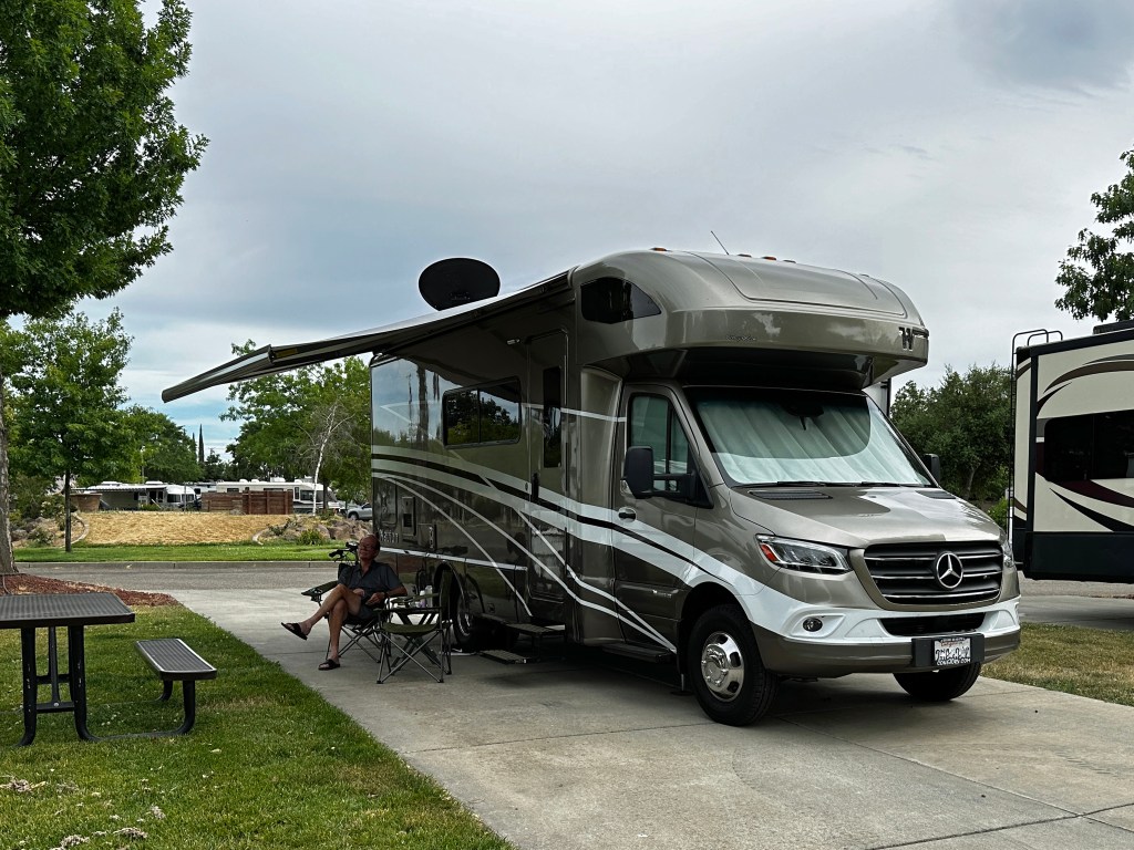 We had thought to stop at Rolling Hills RV Park in Corning, because they have a great 18-hole golf course, but they were hosting a tournament today, so we continued a little more north to the KOA in Red Bluff. This campground is 5-star and has a discount grocery chain next door (a plus for those without tow vehicles - us - or those who do not want to unhook their tow vehicle to drive one block).