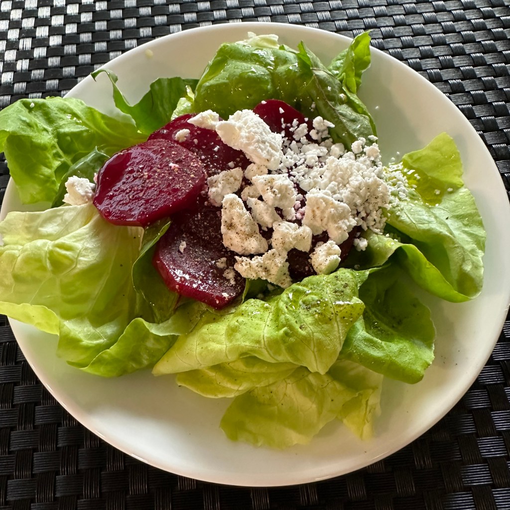 Due to the generosity of our sister-in-laws. we only needed tomatoes, so I did trek across the street. Ginger and Bill's neighbor provided lovely apricots. Gina and Steve provided beets and potatoes. I made a quick sauce of the apricots, which was served over sauteed boneless/skinless chicken thighs. The new potatoes were baked and topped with salted butter and sour cream. The beets were roasted and plated along with the beet tops and butter lettuce, sliced, with crumbled feta. Life is tough on the road.