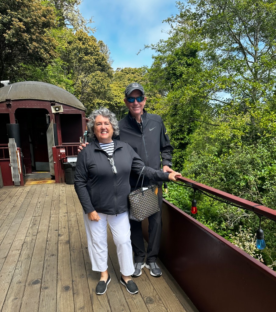 We headed to downtown Fort Bragg to catch the Skunk Train for a two-hour adventure. NOTE: this adventure used to be quite a bit more of an adventure as the tracks travel to Willits, California... but unfortunately there was a tunnel collapse, blocking the track, and the path is still not clear. So, the train is pushed up to a lovely clearing where a pretty pavilion has been constructed. Here guests can relax, play cornhole, hike a few trails, or sip on a cold beer for 45 minutes... then the train is pulled down the tracks to the station. The draw now is simply the scenery - towering Redwoods lining Pudding Creek. A moist green forest of green for all to enjoy. It's a big tourist draw and we are big tourists.