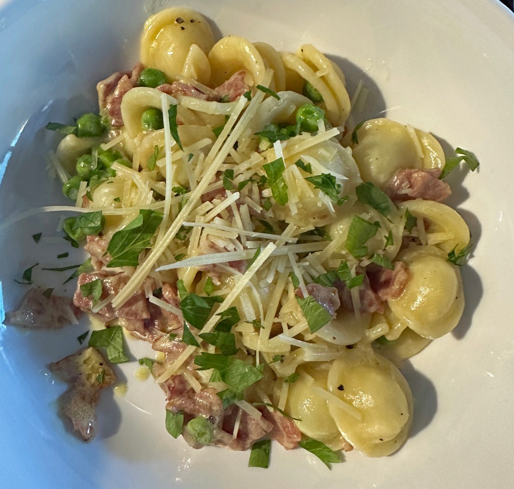 Dinner was a salad with tomato and avocado, homemade pesto, and fresh mozzarella. I boiled Little Ear pasta (they do take forever to boil), added frozen peas and sautéed turkey bacon... with a splash of cream and shredded parmesan.