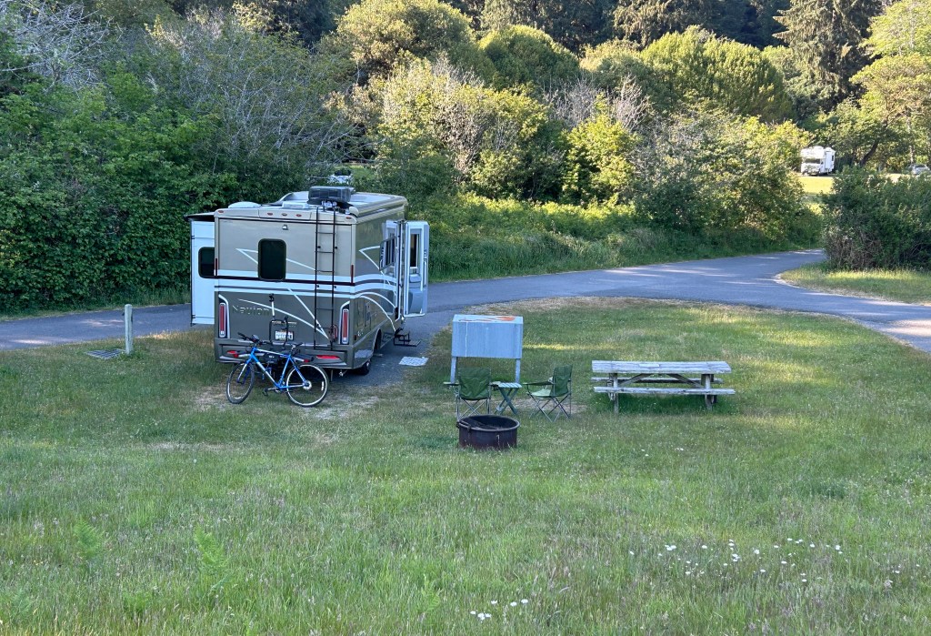 Months ago I reserved a campsite at Elk Prairie Campground in Redwoods National and State Park. This park is full every night in-season, and you must book or be shut-out. They also have tent sites and cabins, bath houses, and park headquarters. Sites are dry-camping only, with potable water spouts every ten sites or so. There are ranger programs and a lot of information on the Redwoods and the elk that hang around the area.