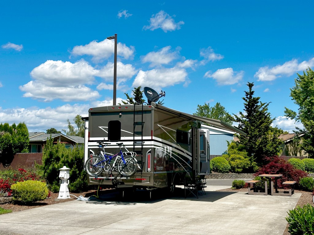 McMinnville, Oregon: After a very busy and kinda exhausting four days at the track, we brought in the slide room and headed out to the airport to return our rental car. DT drove the RV. I drove the POS Honda Civic. (No kidding, this car was so low to the ground, we both struggled getting in/out - and we have a one-foot height differential!) Old People Problems. We stopped to fuel-up both vehicles and just as I finished returning the car, Dave was outside the terminal waiting for me in the RV. Effortless.