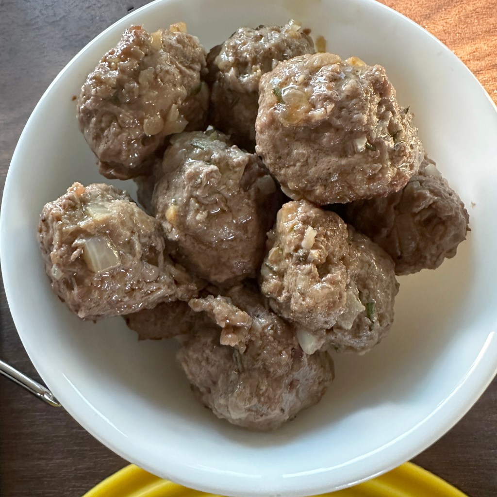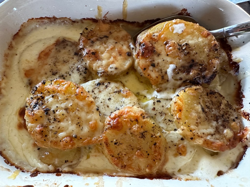As nice as the meatballs were, nothing topped the potatoes. The pommes had been out of the ground for a week. The two potatoes were sliced (not peeled, as the skin is soft and paper-thin) and blanched, then bathed in heavy cream, salt, white pepper, nutmeg, and Gruyere cheese. The resulting blob was placed in my teeniest baking dish (4x6?), and baked in my Barbie Easy Bake Oven, until bubbly and golden.