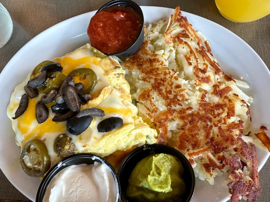 My Driver had two over-easy eggs with hash browns and toast, while I was a bit more adventurous with a Mexican-style omelette - spicy and loaded with jalapeños. Fun place. We recommend - huge portions though.