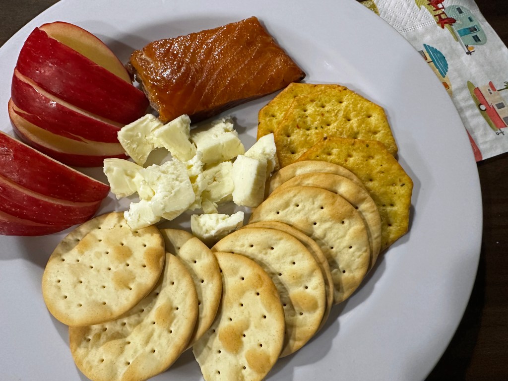 By the time the meet was concluded, Rita and I were so cold! She raced off to her family and DT and I raced off to our RV to watch the Dodger v Giants game and/or the track meet replay. The snack plate tonight was not as exciting as the past two nights because we were not very hungry after our late lunch repast. The rest of the smoked salmon we bought in Fort Bragg, some crackers, some cheese, an apple.
