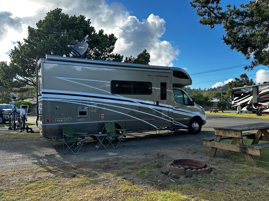 Campground Information: Cape Kiwanda RV Park - This is a very old campground, with sewer connections in the grass and old-school electric posts. RV sites are paved, and the picnic tables and firepits are in grass. Many amenities, as they also have a hotel and the RV sites can use the indoor pool/hot tub. Shop, RV supplies, laundry, bath houses, walk to many restaurants and the beach is across the street. There are rabbits everywhere, so be aware if you bring your dog. We are paying about $119 per night for a drive-through site.