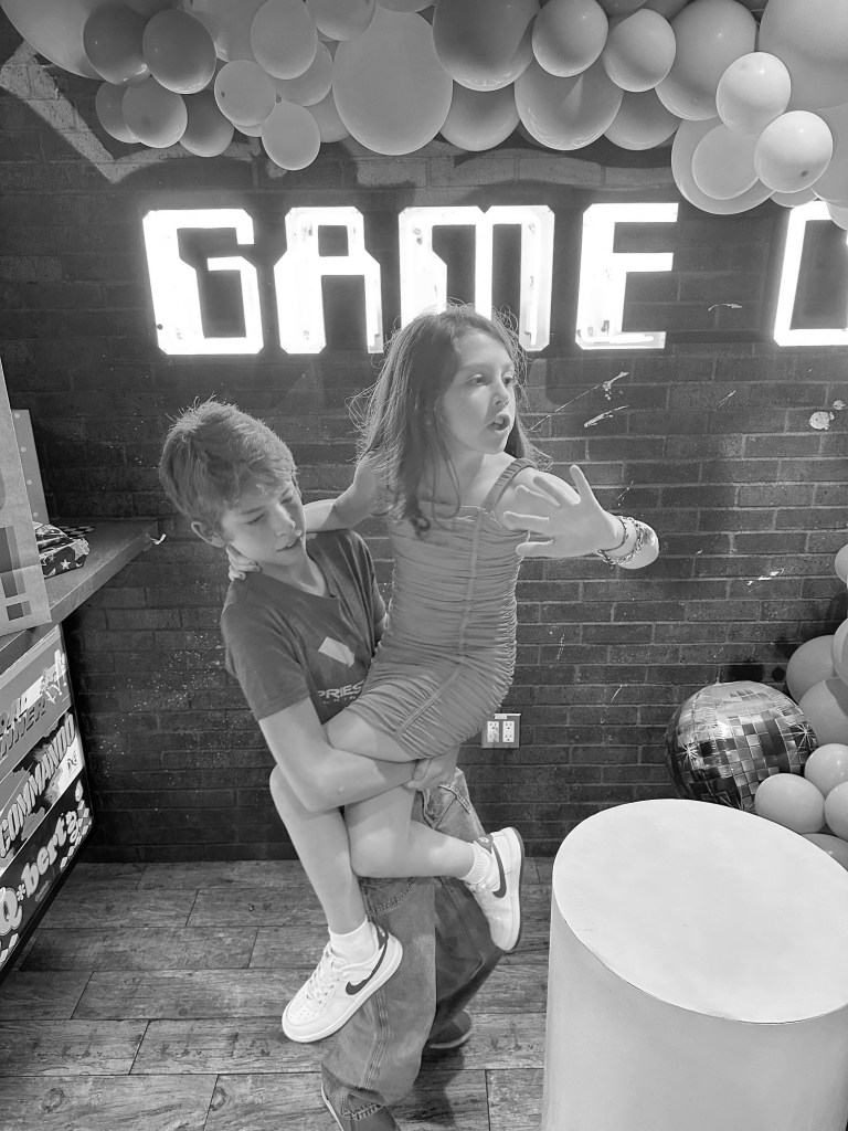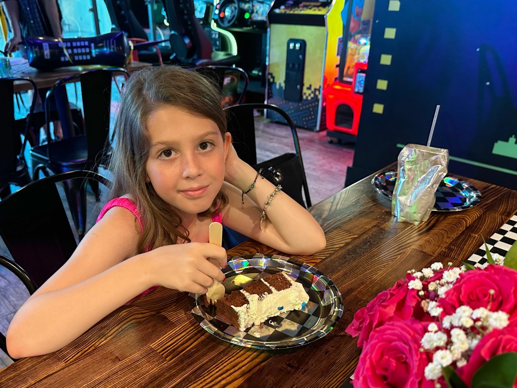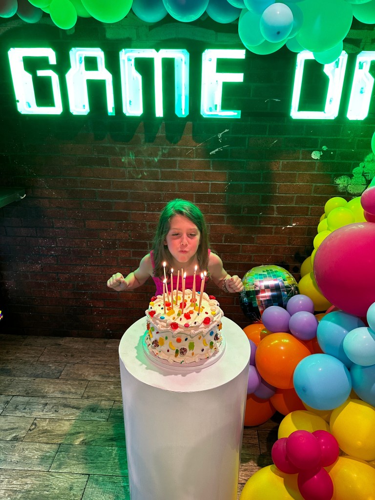 Lucile's party was held at an event space. It had tables and chairs, a bar/serving area, bathrooms, and about a zillion video and arcade games on two floors. Guests could just play all day - no coins or tokens needed. It was very fun for the guests. Lucile invited her family, friends and every kid (14) in her class at school. Parents were invited as well, so there were about 45 guests.
