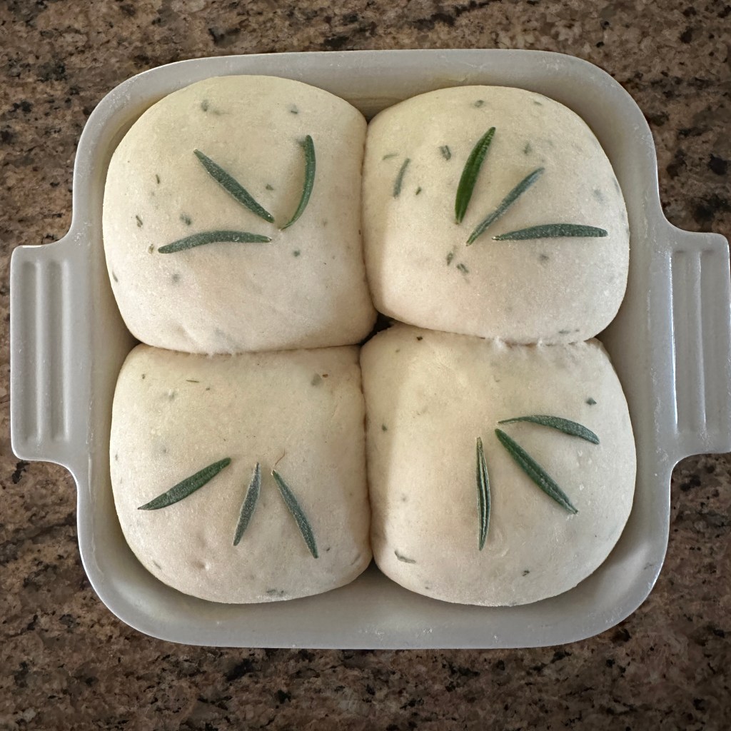This season our clubhouse restaurant started serving little rolls baked in a teeny casserole. I have made these a few times (using my recipe and preparing the dough by plopping everything in the bread machine). We still can't eat all four, but the rolls were big enough to use for lunch sandwiches the next day. These rolls were made with milk, butter, flour, salt, sugar, yeast and a bit of rosemary from the garden.