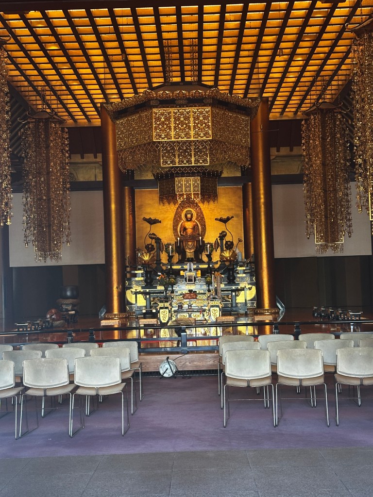 After a stroll through the gift shop, we headed out across the street to visit the Zojo-ji Temple. With our usual luck, the temple was closed, but the doors were open so we could see inside.