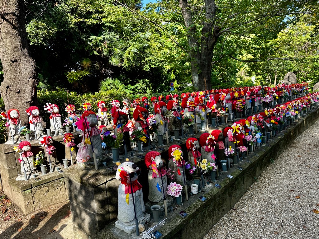 Each stone cat statue represents a stillborn or miscarried baby. They wear red caps and aprons to keep warm. Nearly broke my heart. By the aging of the stone, it is easy to see that some cats are new, others ancient.
