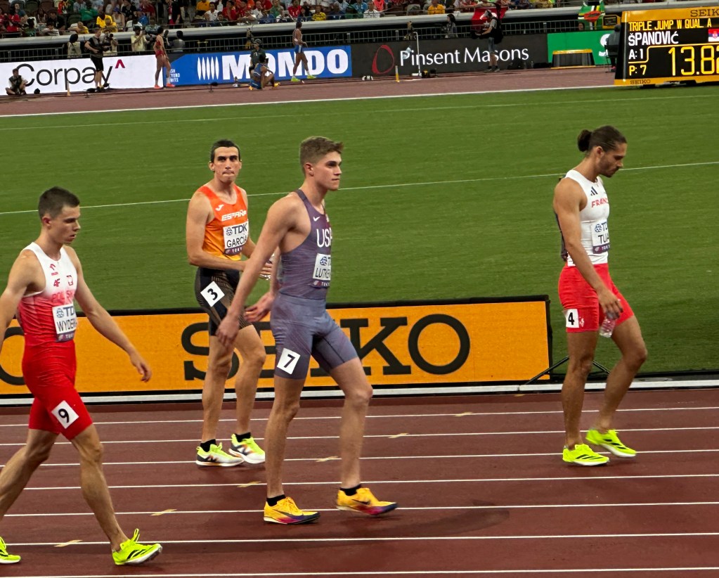 Jasmine Moore qualified to advance to the triple-jump final. Long-time American favorite, Grant Holloway, 27, did not advance in the 110m hurdles. Holloway is a 3-time World Champ, and an Olympic gold medalist. This was sad. The final was the last event of the evening, and the gold went to American Cordell Tinch, followed by two Jamaicans. The green and yellow Jamaican fans in the section next to us went crazy mon. Deh not fasa den Tinch.