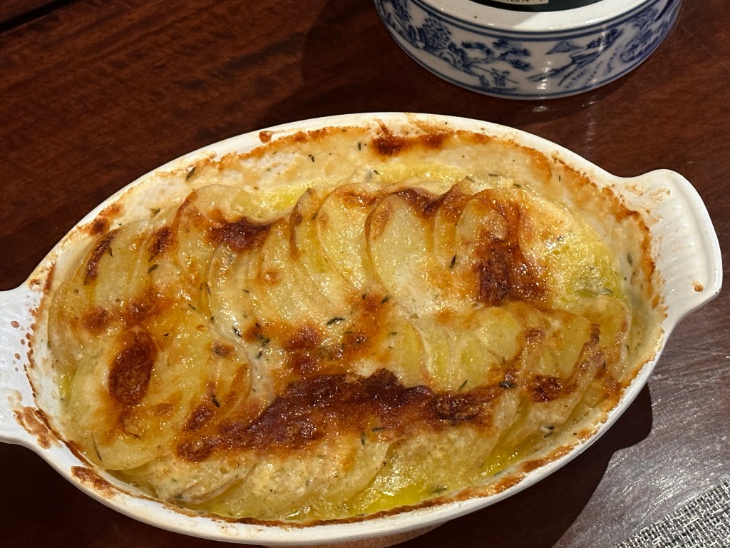 The duck legs were served with a potato gratin that I make all the time, but never use a recipe... but usually it is 2-3 Yukon Gold potatoes (not peeled, sliced thin, and blanched for 3-5 minutes until tender but not breakable), tossed with cream, salt, white pepper, fresh or dried thyme, and a pinch of nutmeg... then tossed with freshly grated gruyere cheese. Baked at 375° about 30 minutes, or until browned and bubbly. DT liked this meal, but felt my home-made 3-6 day duck confit tastes better. Maybe I use different herbs? Who knows, as I rarely would use the exact same herbs each time.