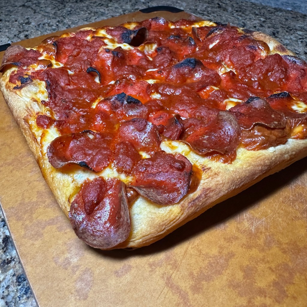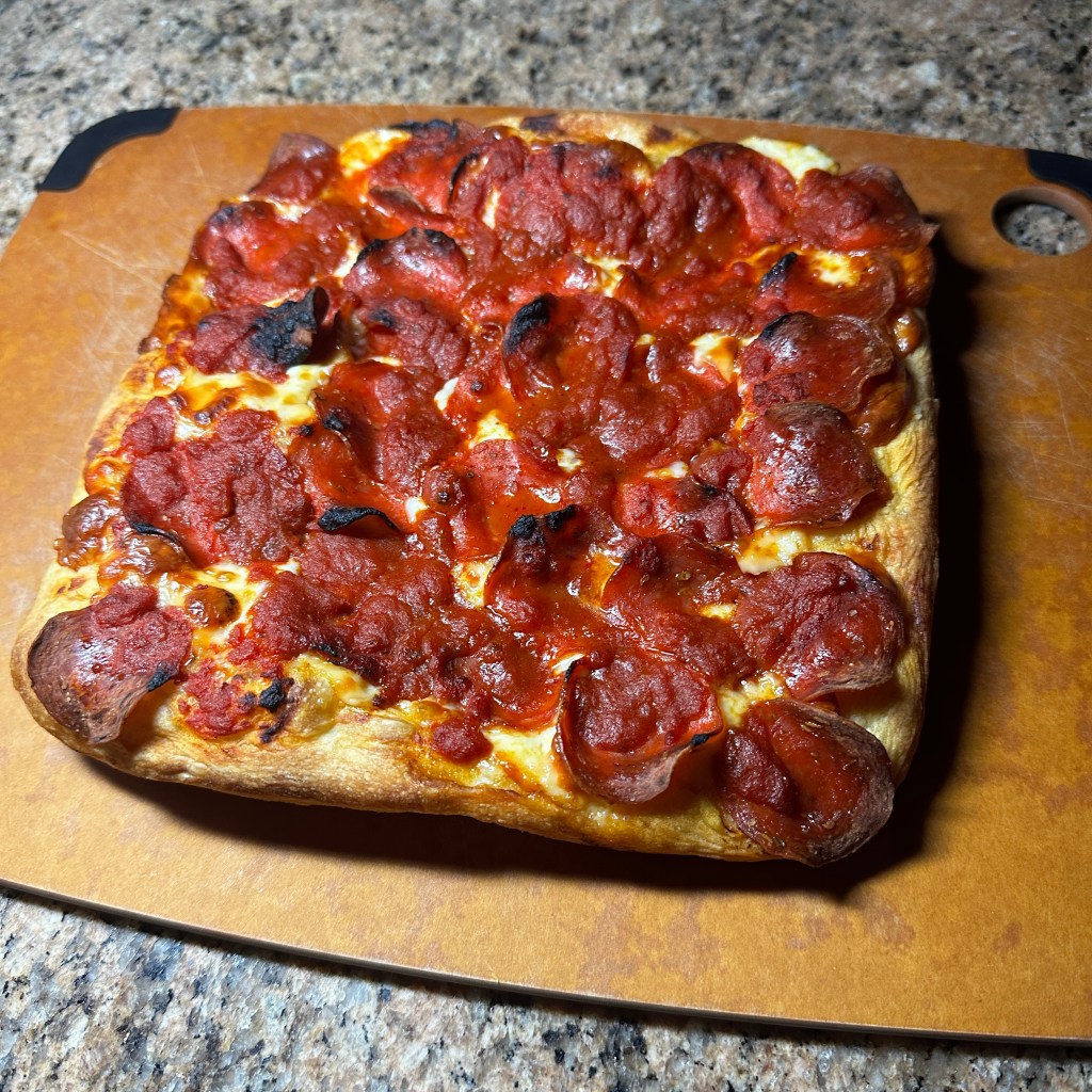The Ducks were playing Michigan State on October 4th. Often I will plan our tailgate menu around the opposing team's location/foods. Only thing I could think of for Michigan was fudge from Mackinac Island, and pizza I had never tried from Detroit. With a little research, it seems the dough is baked in a pan (ala focaccia), the cheese is put on top of the dough, then the toppings, and the sauce is the last topping. I used this recipe, making the full dough recipe in a food processor. I froze half the dough for another use and baked the pizza in an 8x8 metal cake pan. For topping (more poultry!) I used Applegate's Turkey Pepperoni, and hand-cubed low-moisture mozzarella. The sauce was Rao's Pizza Sauce. This pizza was quite good. Crispy edges, crispy crust bottom, the Ducks beat Michigan State, and there is crust for another pizza in the freezer.