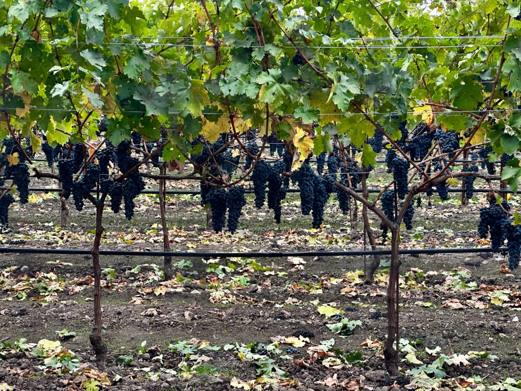 After unloading our purchases from Oxbow into our RV, we again drove north on the Silverado Trail in our rental car for our lunch reservation… but the views were not as lovely as yesterday. Dear Reader, it began raining. It was 62°. Cloudy. The brilliant yellow and orange leaves on the vines seemed drab without the sun. Dave knew a side road, so we headed down this unknown lane and found a vineyard with grapes still hanging on their vines:
