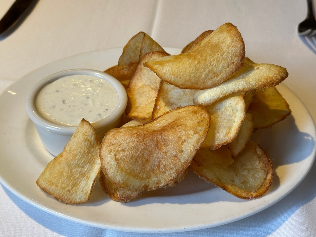 Today we were going to Grandma’s favorite spot, Mustard’s Grill for lunch. The place was packed, but we were seated at a very nice table where we had a view of all the action. They offer house-made potato chips, so we ordered this as our appetizer, while looking over the menu and the wine list (I kid you not, the wine list was 14x18”, printed double-sided, with bottles from $45 to over $3000!) (I ordered a glass of Sonoma pinot noir and My Driver had iced tea.)