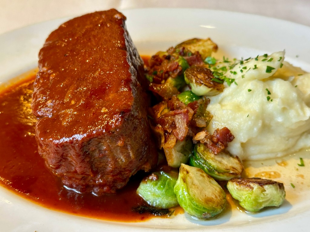 The daily lamb special was a lamb burger today, so DT ordered the lamb. I asked about the contents of the meatloaf and when our server said it was all-beef, went ahead and placed my order. When it arrived it was served with Brussels sprouts (no mention of a vegetable side on the menu), but they were covered in bacon. I just pushed them aside, pretended they were not there - but the meatloaf was kinda cold.
